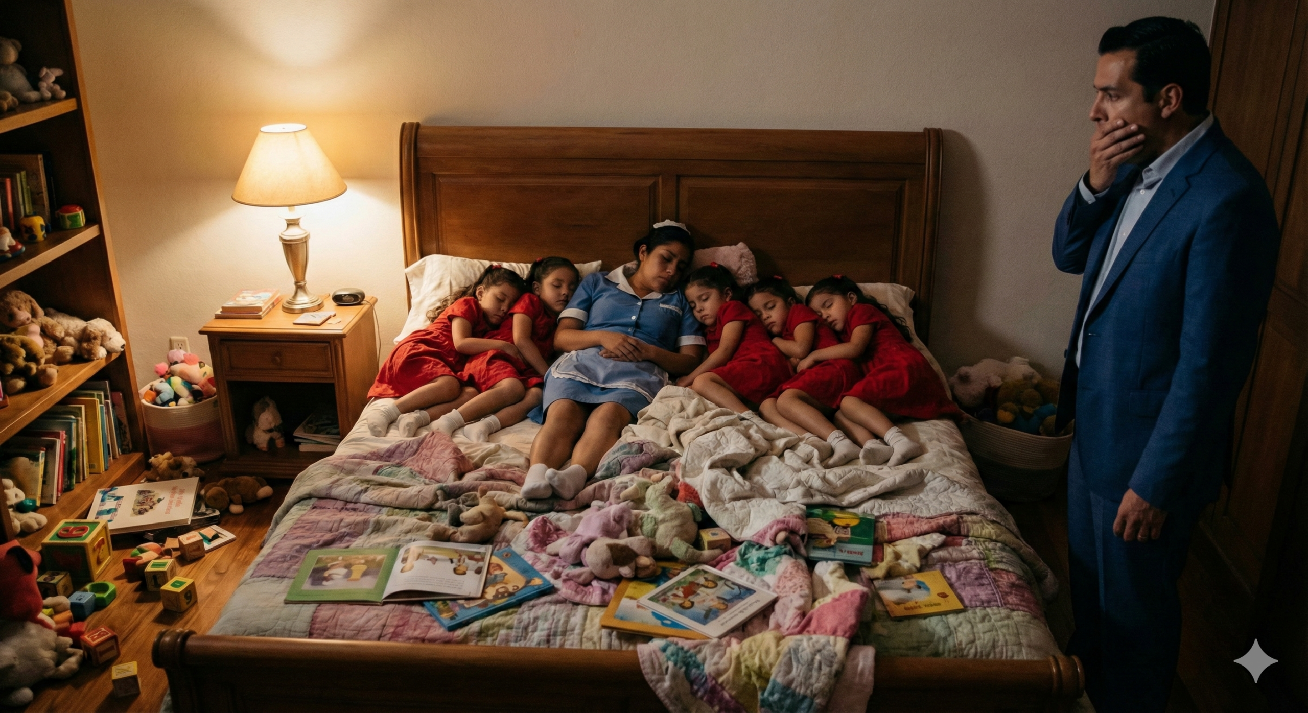 Detrás de ella, en el umbral de la puerta principal, seis figuras pequeñas observaban la escena. Mariana, mi hija mayor de 12 años, estaba al frente, con los brazos cruzados y una sonrisa que me heló la sangre. A su lado, las gemelas Beatriz y Bianca chocaban las manos como si acabaran de ganar la Copa del Mundo.