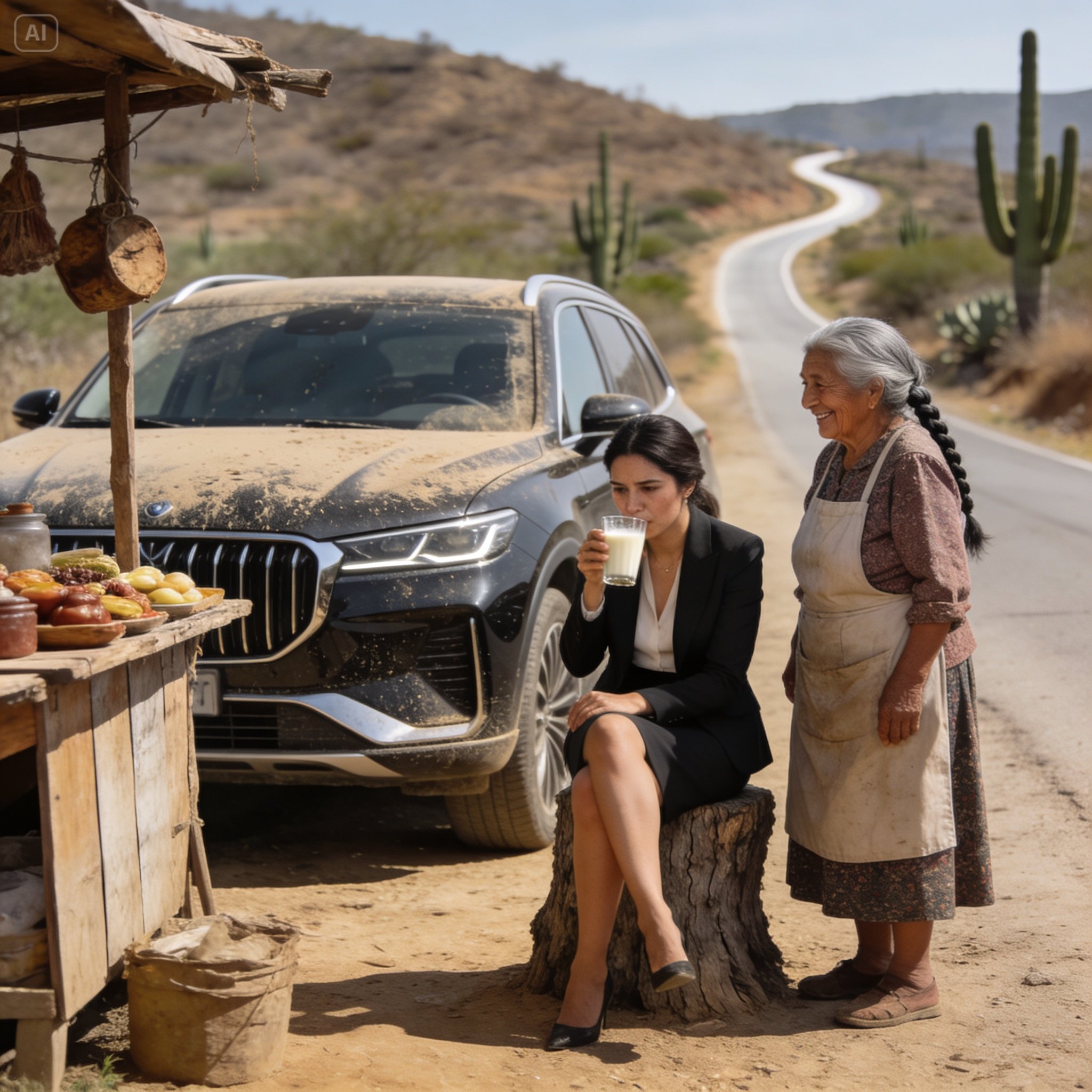 Cerró la camioneta con el seguro manual, tomó su bolso —instinto de ciudadana desconfiada— y comenzó a cruzar la carretera. El asfalto irradiaba calor, deformando el aire. Sus tacones se hundían ligeramente en la brea derretida y luego en la tierra suelta del acotamiento. Se sentía ridícula. Una mujer vestida para una junta de consejo, caminando entre cardos y piedras en medio de la nada.
