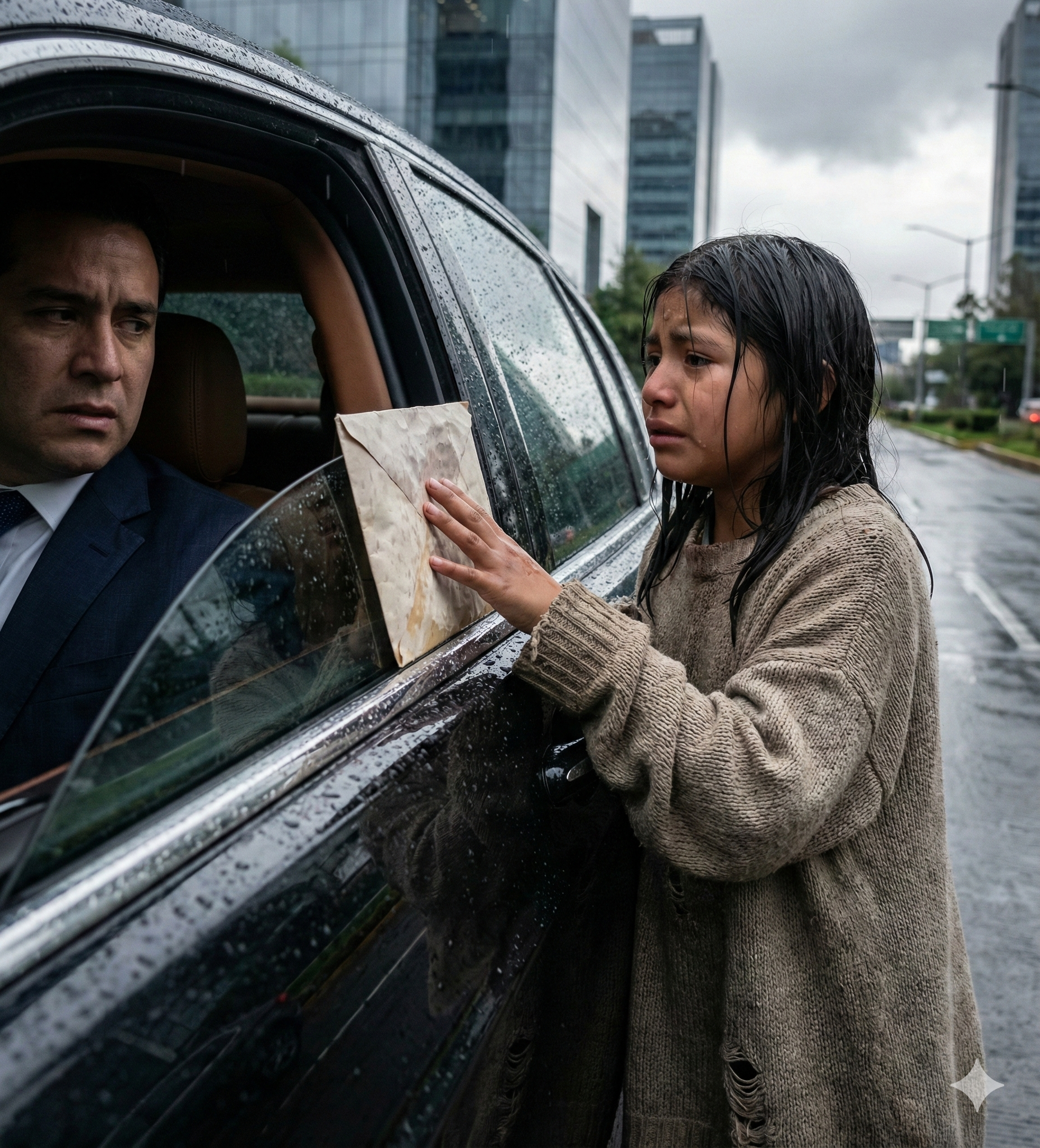La niña estaba ahí. Se había levantado. No corrió. No huyó asustada como hubiera hecho cualquier otro niño. Se plantó frente a mi ventana lateral, ignorando al valet que le gritaba de nuevo. Estaba empapada hasta los huesos. Su cabello negro se pegaba a su cara, goteando agua sucia. Llevaba un suéter escolar azul marino, desgastado en los codos y dos tallas más grande, probablemente heredado de un hermano mayor o comprado en un tianguis de ropa de paca.