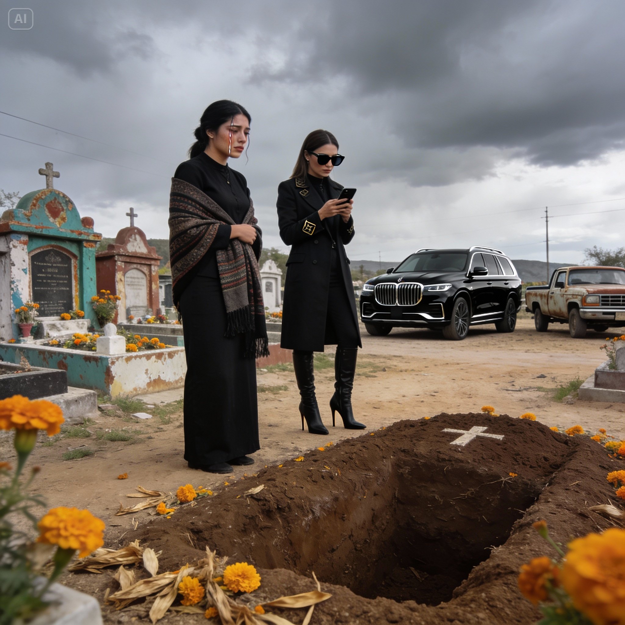 Sin esperar respuesta, Sofía dio media vuelta. Su abrigo negro ondeó con el viento mientras caminaba con paso firme hacia la salida del panteón. Allí, aparcada ofensivamente entre una camioneta Ford oxidada del año 80 y un Tsuru abollado, estaba su camioneta: una SUV negra, enorme, blindada y brillante. Parecía una nave espacial estacionada en medio de un corral. Laura la vio subir, vio cómo el motor rugía suavemente, poderoso, y cómo las llantas levantaban una nube de polvo al arrancar, cubriendo por un momento la vista de las tumbas.