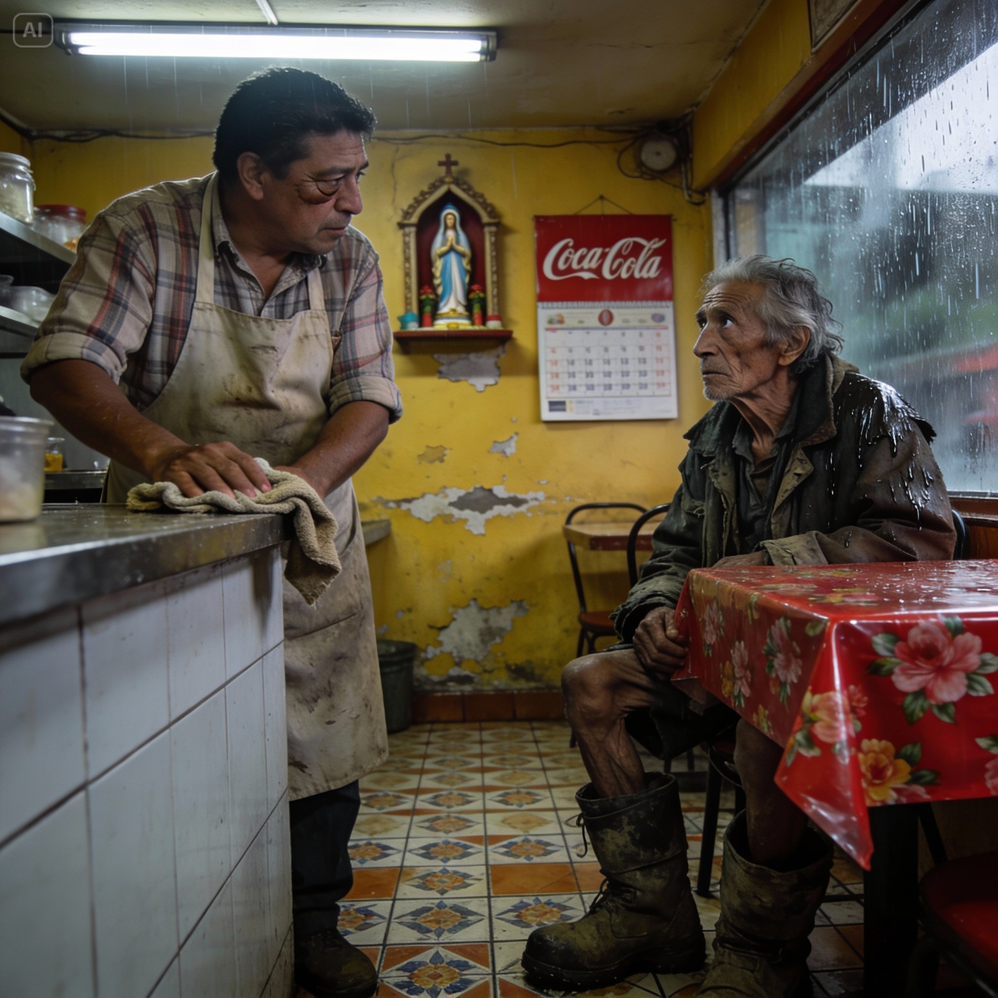 El extraño abrió la boca para decir algo, pero solo salió un vaho blanco. Sus labios estaban morados. Asintió levemente, un movimiento rígido, y arrastró los pies hacia la mesa. El sonido de sus botas mojadas chillando contra el piso de loseta fue el único ruido en el local. Se dejó caer en la silla con un suspiro que sonó a dolor puro, y sus manos temblorosas se posaron sobre el mantel de plástico floreado, acariciando la superficie como si fuera seda fina.