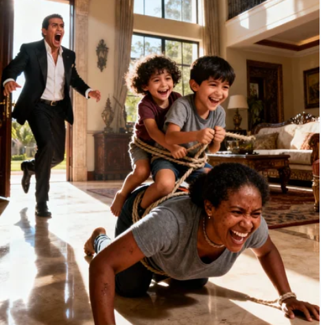 Estaban riendo. Pero no era una risa normal. Era una carcajada salvaje, ruidosa, casi histérica, de esas que hacen que te duela la panza. Juana relinchaba juguetonamente, sacudiendo sus trenzas, sin aliento por el esfuerzo, mientras los niños se aferraban a ella como si fuera su salvavidas en medio de un naufragio.