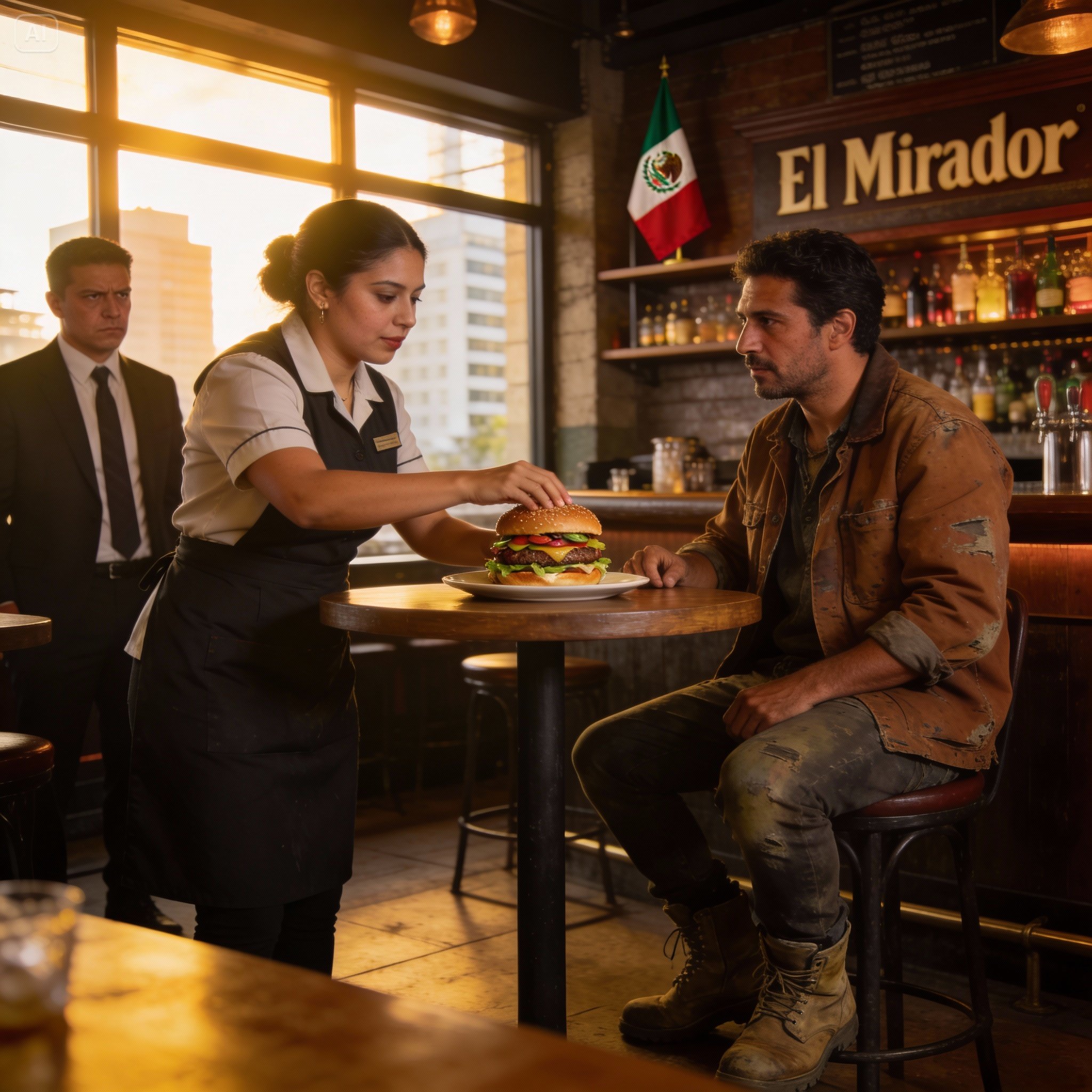 El aire en “El Mirador” se sentía pesado, como si el lujo de las mesas de mármol y las sillas de terciopelo no fuera suficiente para ocultar la podredumbre que crecía en la oficina del gerente. Alejandro, sentado en su banco de la barra, masticaba lentamente la hamburguesa que Sara le había regalado. Sabía que cada bocado tenía un precio, y no era el que marcaba la carta. Era un precio que Sara pagaría con su propio esfuerzo.
