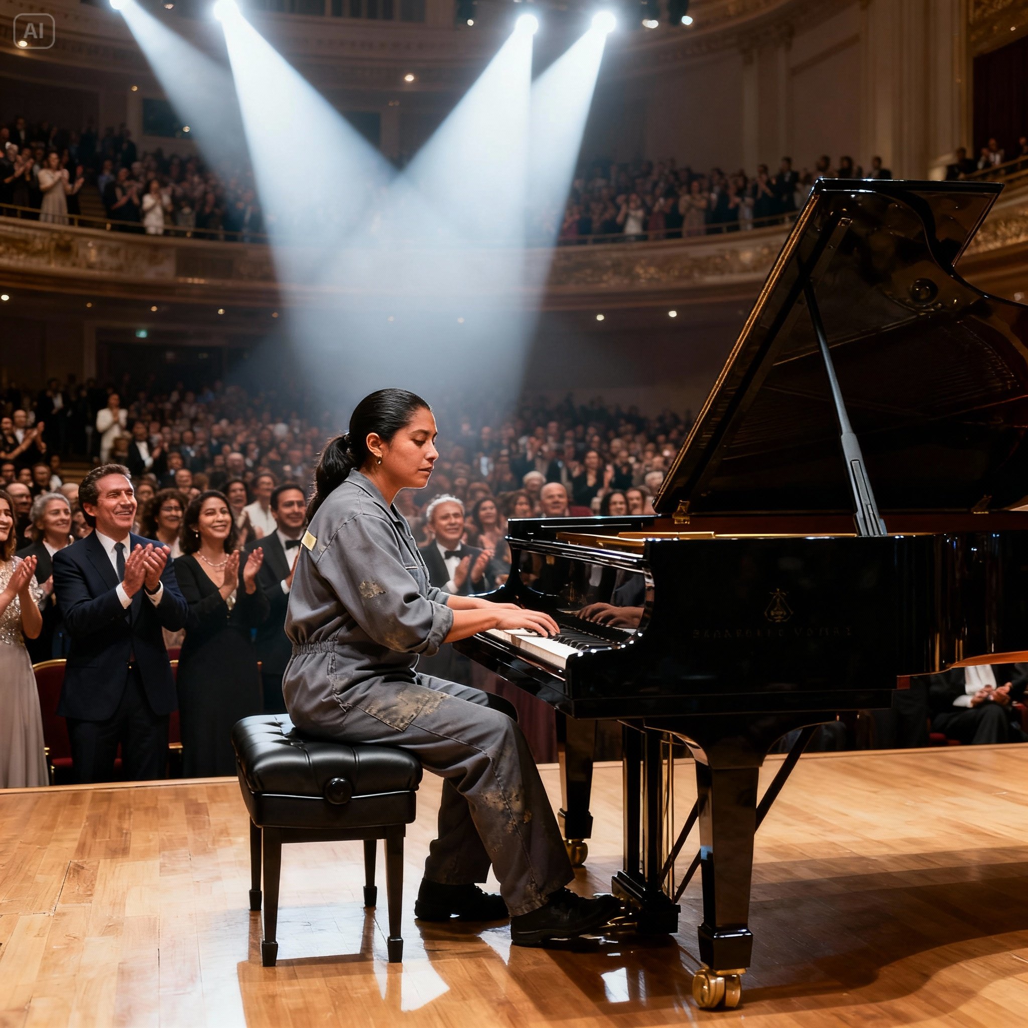 El eco del último acorde de Rachmaninoff seguía vibrando en las copas de cristal cuando el salón estalló. No era un aplauso normal; era el sonido de trescientas personas recuperando el aliento. Yo estaba ahí, sentada frente al piano, sintiendo el sudor frío resbalar por mi nuca. El uniforme gris me pesaba como si fuera de plomo.