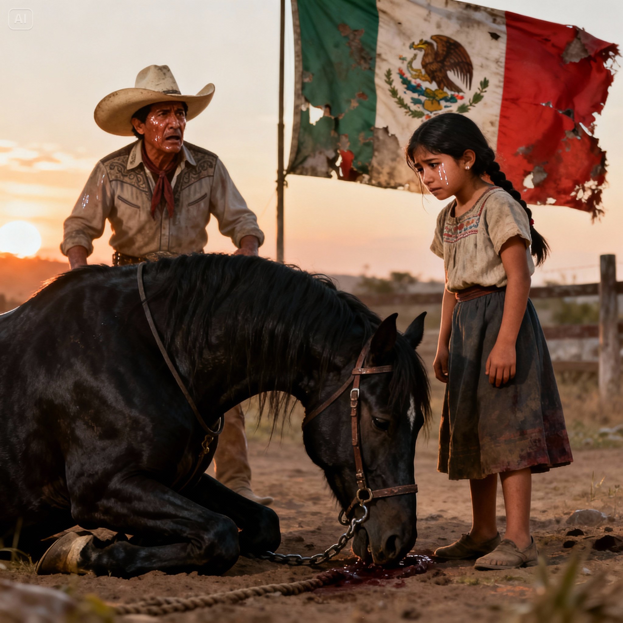 Todos sabían que era una burla. Nadie en su sano juicio se acercaría a esa bestia. Pero entonces, la multitud se abrió. Y ahí estaba ella. Una niña. No tendría más de doce años. Ropa gastada, ojos grandes, color café, de una tristeza infinita. Era la huérfana del pueblo, la hija del peón que murió hace un año. Don Hilario se rio, una risa seca y despectiva. “Órale, chaparrita, ¿tú también quieres probar suerte? ¿O solo vienes por el chismecito?” La niña no respondió con palabras. Su mirada estaba fija en el caballo. Y en ese momento, el caballo, “El Diablo”, se detuvo. Dejó de relinchar. Algo en sus ojos se conectó. Una chispa de reconocimiento. La niña dio un paso al frente. “Si lo monto, me da los diez millones”, dijo su voz, pequeña pero firme. El patrón se burló: “Trato hecho. ¡Pero no me hago responsable si te pisotea, escuincla!”
