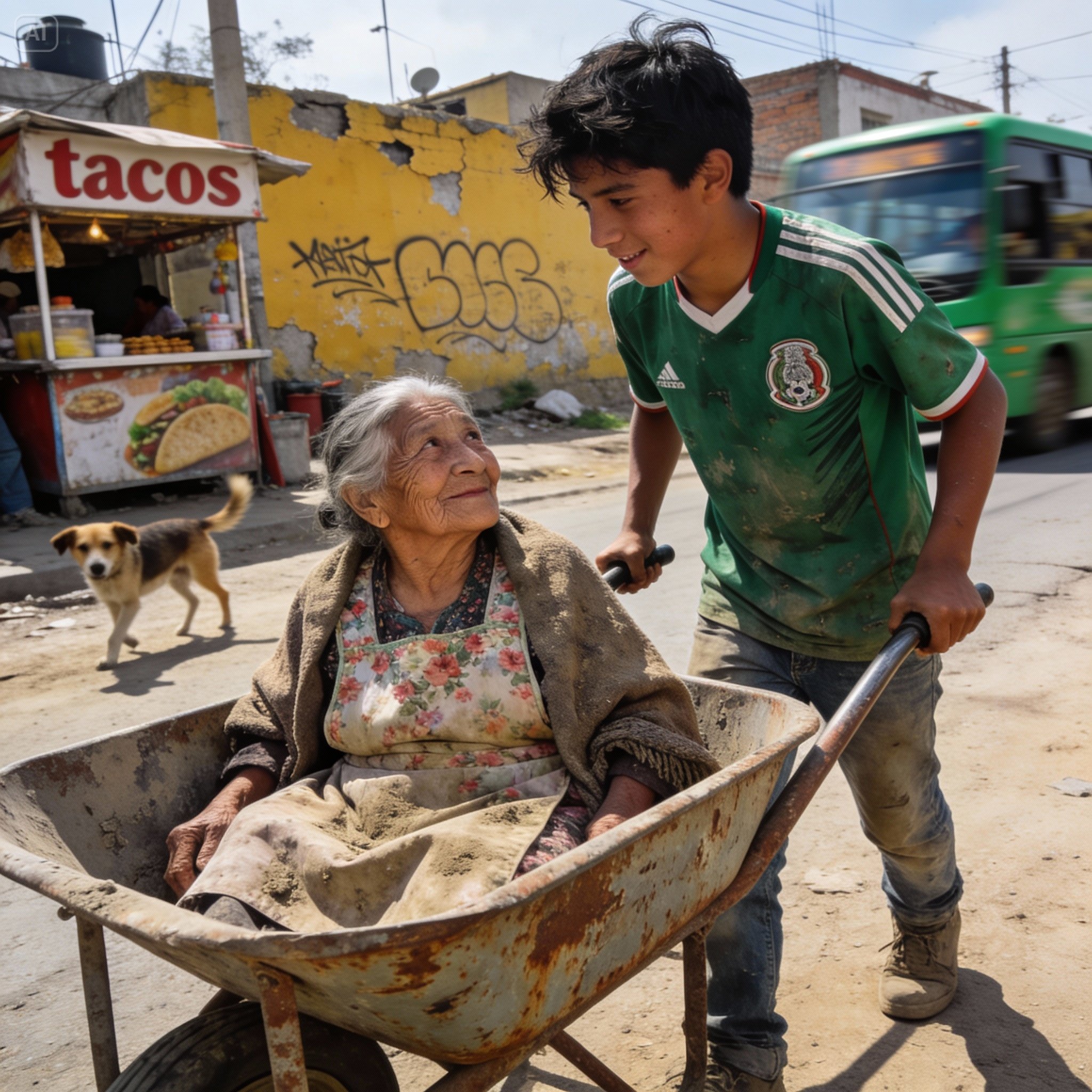Me quedé ahí parado un segundo, viendo cómo la vulnerabilidad se la comía viva. No podía dejarla ahí otra noche. Sería inhumano. Miré al otro lado de la calle. Ahí estaba el Tío Chuy (no es mi tío de verdad, pero así le decimos todos), un vendedor de cebollas que ya estaba recogiendo su puesto. A su lado, estaba su herramienta más preciada: una carretilla vieja, oxidada, manchada de cal y tierra.