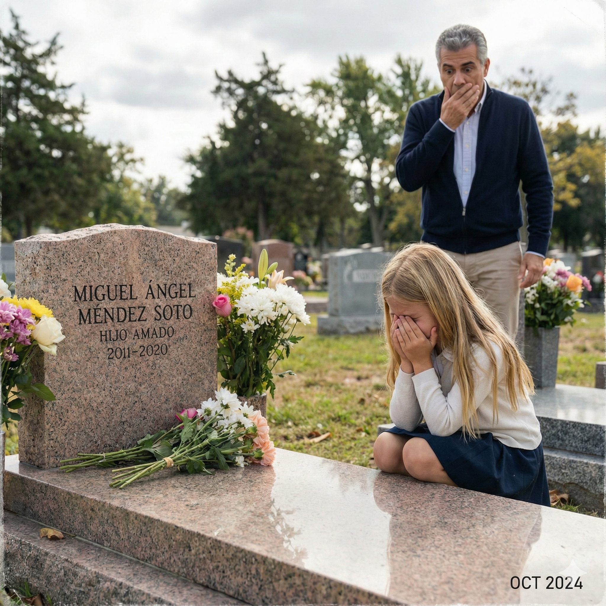 Me quedé ahí, con el corazón galopando como un caballo desbocado. “Miguel sabía algo”. ¿Qué podía saber mi hijo de nueve años que yo no? Bajé la vista hacia la tumba, confundido, y vi algo brillando en el pasto húmedo donde la niña había estado sentada. Era una fotografía plastificada, medio enterrada en la tierra.