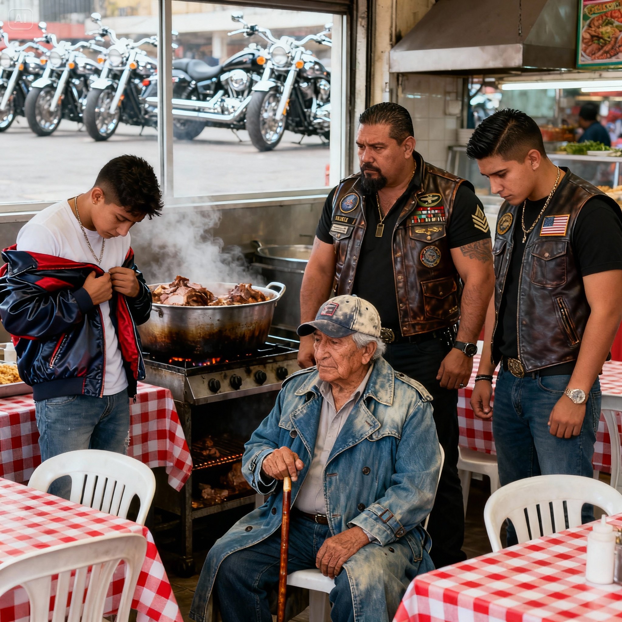 Fue el momento en que el líder de los chavos cruzó la línea. Se inclinó, tomó el vaso de agua del Capitán y fingió beber, luego hizo un gesto exagerado de asco y lo devolvió a la mesa. “¡Qué asco, abuelo! ¡Ya le dejaste baba de dinosaurio!”, gritó, y el local se quedó helado.