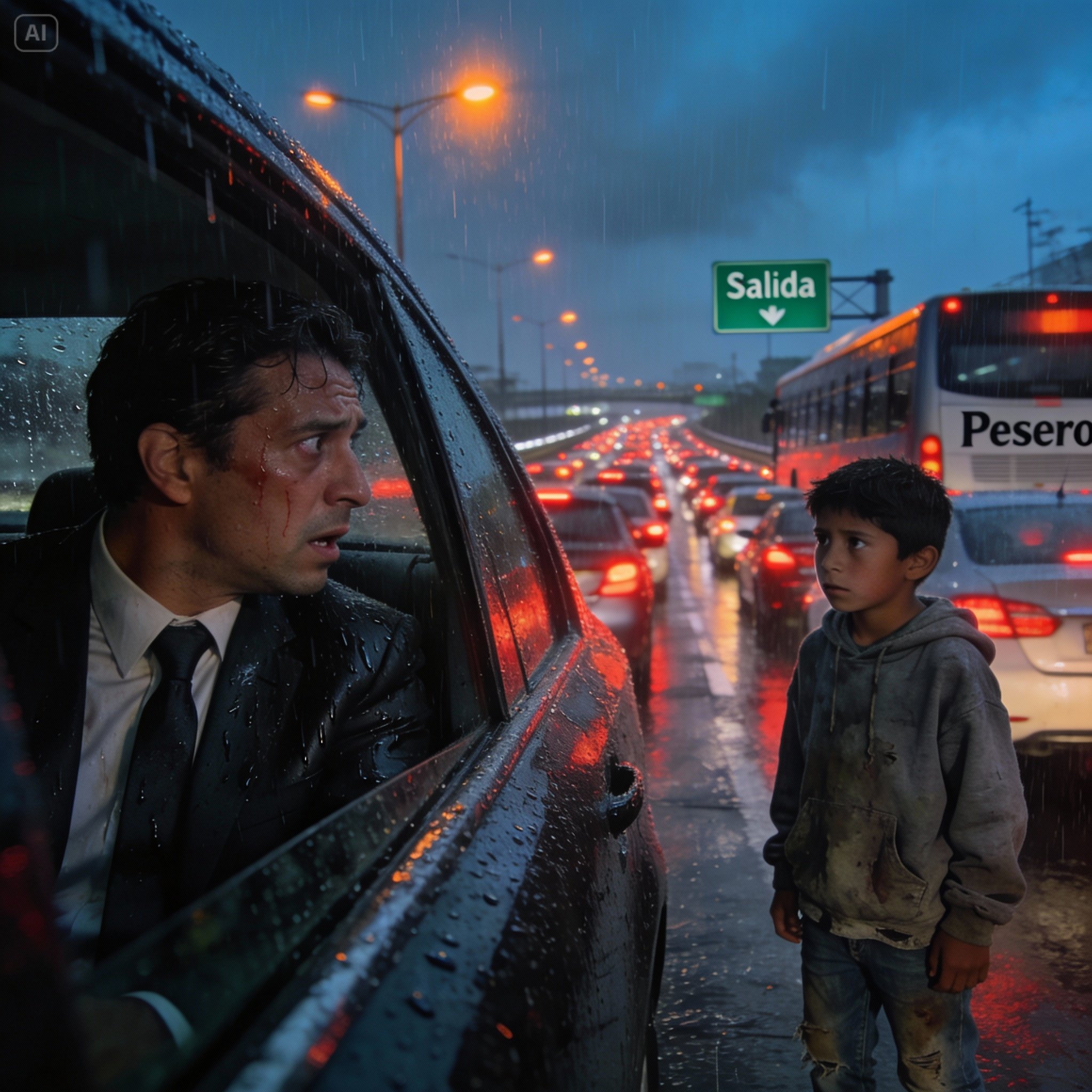 —¡Avanza, maldita sea! —gritó, golpeando el claxon inútilmente. El sonido se perdió en la cacofonía de miles de motores, bocinas y el repiqueteo furioso del granizo contra el techo del auto.