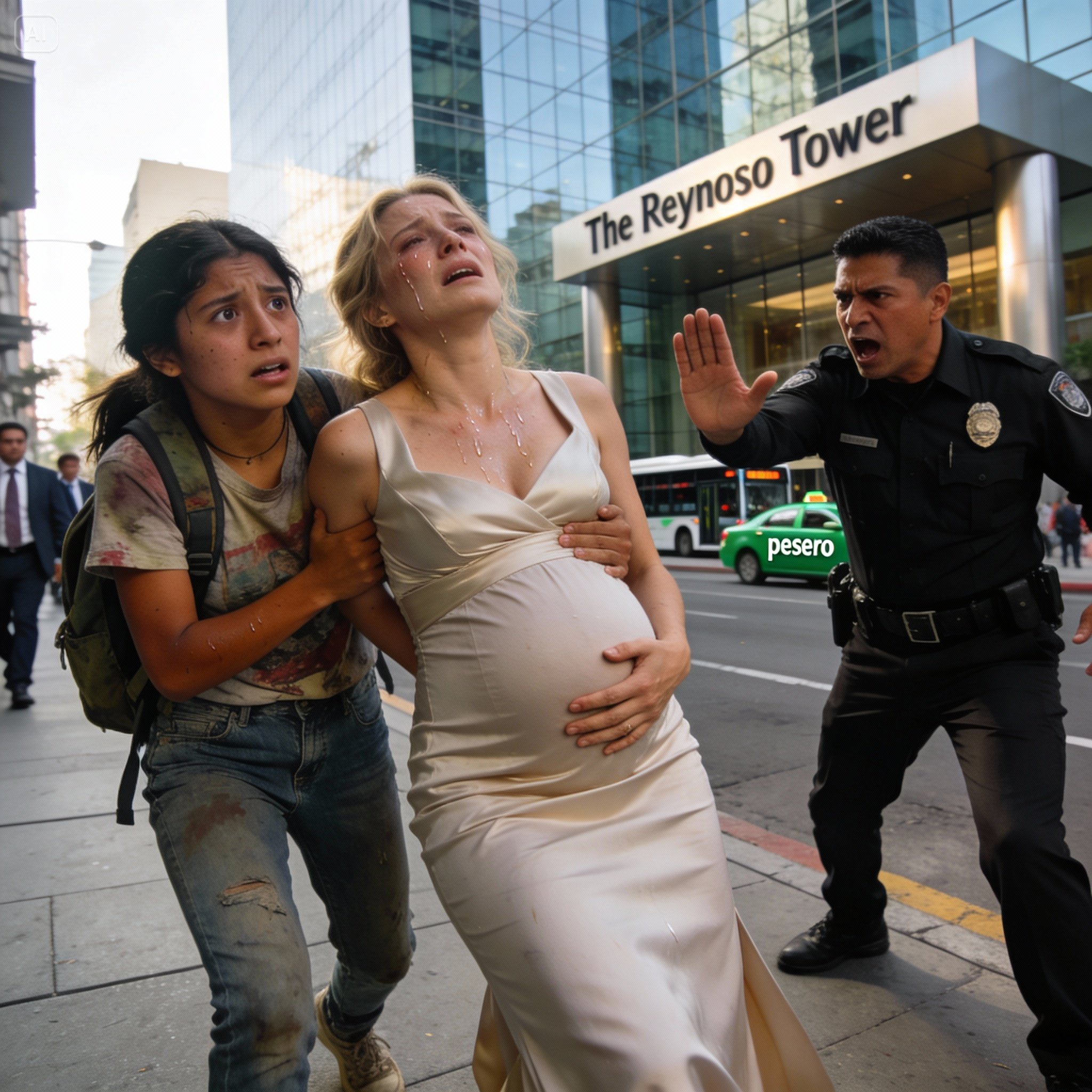 Una mujer. No era una oficinista cualquiera. Era una mujer hermosa, de piel clara, vestida con un vestido de maternidad color crema que gritaba elegancia y dinero. Pero algo estaba mal. Muy mal. Estaba parada cerca de una de las grandes macetas de concreto frente a la torre, tambaleándose.