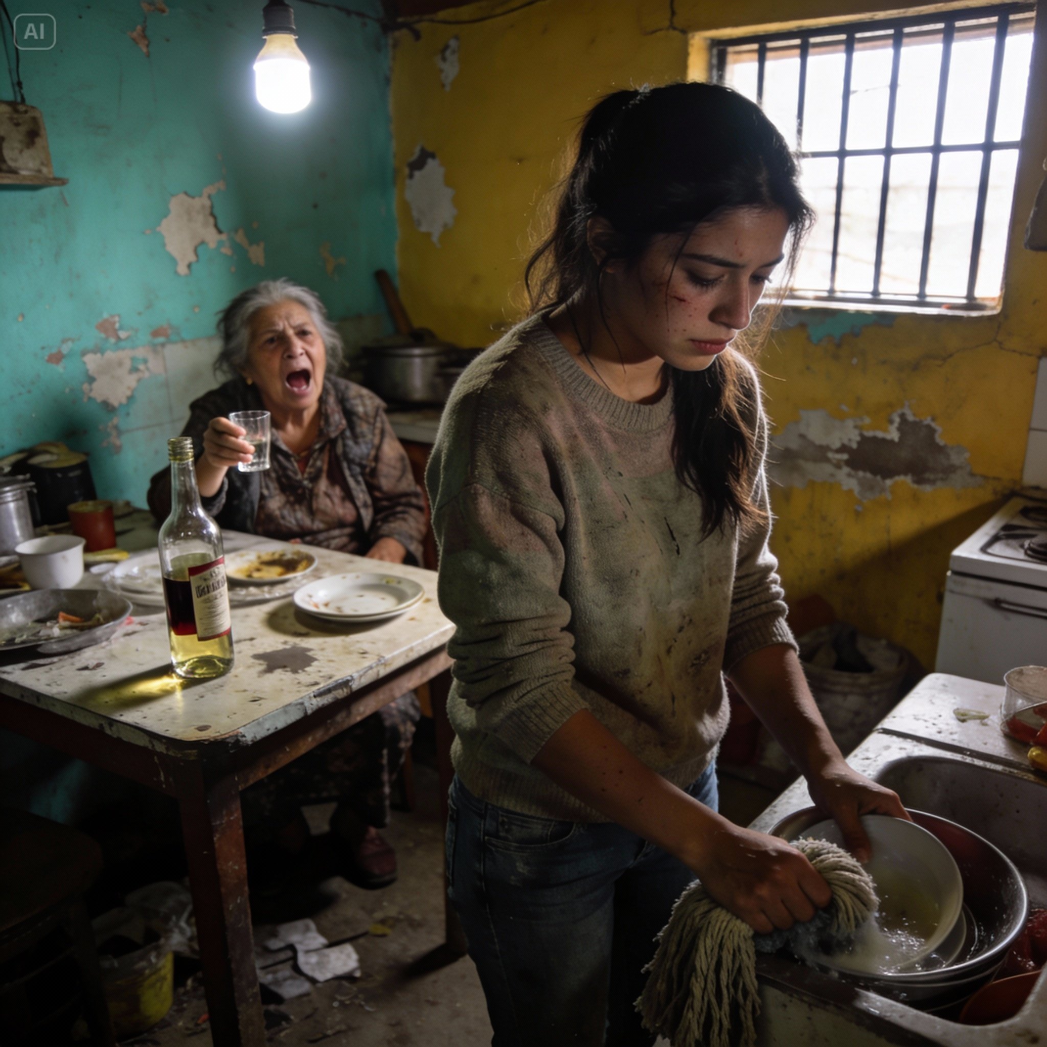 Los “achaques” de Claudia eran una flojera crónica y un amor desmedido por el vino barato de cartón o el aguardiente de caña que vendían a granel. Valentina pasó de ser una niña en duelo a ser la sirvienta de tiempo completo. Se levantaba a las cinco de la mañana para lavar la ropa de la tía a mano, tallando las manchas de comida y vino de las batas grasientas. Tenía que barrer, trapear, sacudir y cocinar. Si los frijoles quedaban un poco salados, Claudia le aventaba el plato. Si no había tortillas calientes cuando ella despertaba de su siesta de borracha, llovían los insultos.