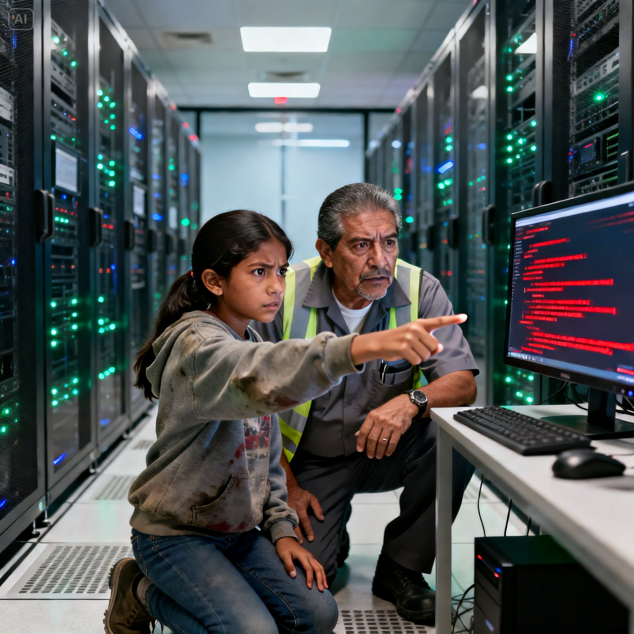 Se detuvieron en seco al vernos. La confusión reemplazó al pánico en sus rostros por un breve segundo. El hombre mayor, que luego supe que se llamaba Armando, el subdirector de operaciones de TI, se congeló al verme señalar el terminal parpadeante. Su mirada pasó de la pantalla a mí, luego a mi padre, y de nuevo a mí. Era una mirada cargada de incredulidad y desdén.