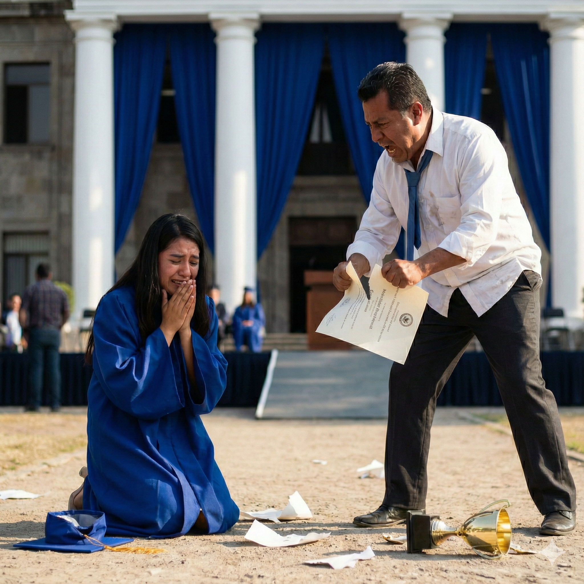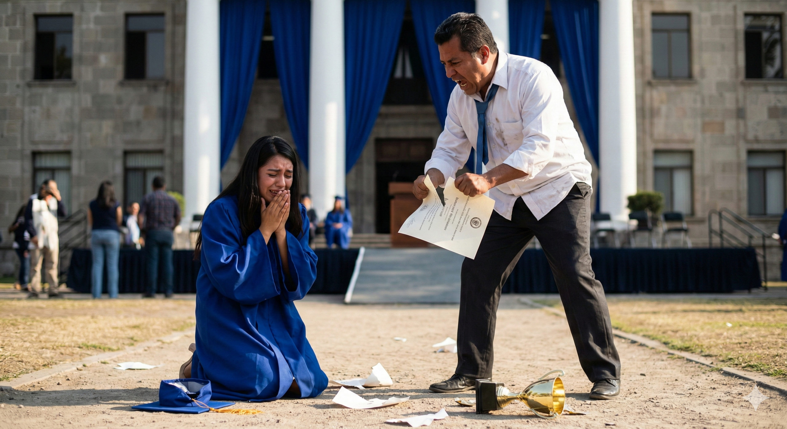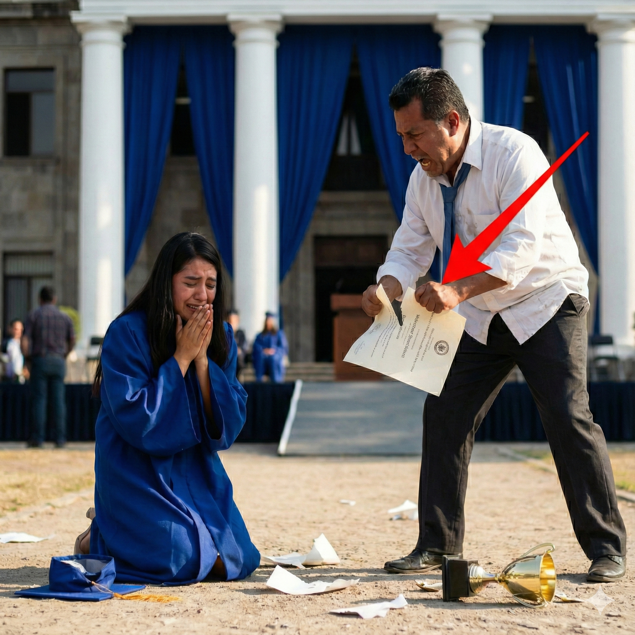 Un murmullo de espanto recorrió la sala. En algún lugar, un programa cayó al suelo. El silencio que siguió fue absoluto, denso. —Papá, por favor —supliqué. Mi voz salió aplastada, pequeña. Extendí la mano hacia mi título, mi boleto de salida de su casa.