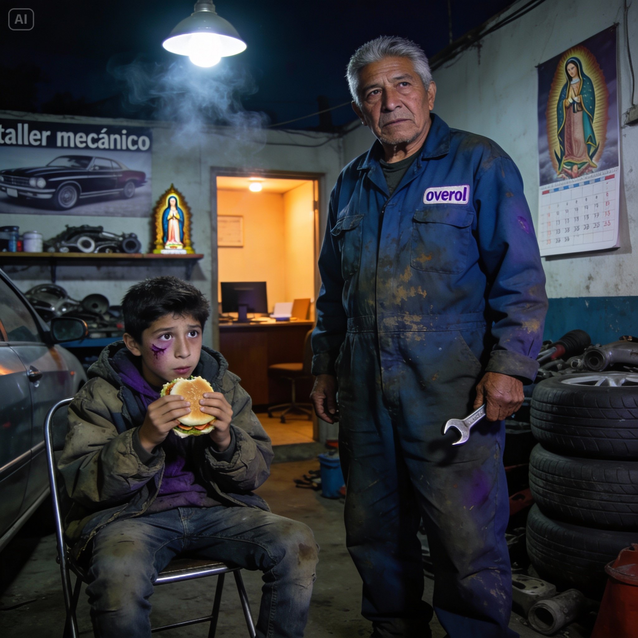 Las lámparas fluorescentes parpadearon y se apagaron, sumiendo el enorme galerón en penumbras. Solo la luz ámbar del alumbrado público se colaba por las ventilas altas, creando sombras largas y fantasmales entre los autos levantados en las rampas hidráulicas. Parecían bestias dormidas, esperando la mano del doctor para volver a rugir.