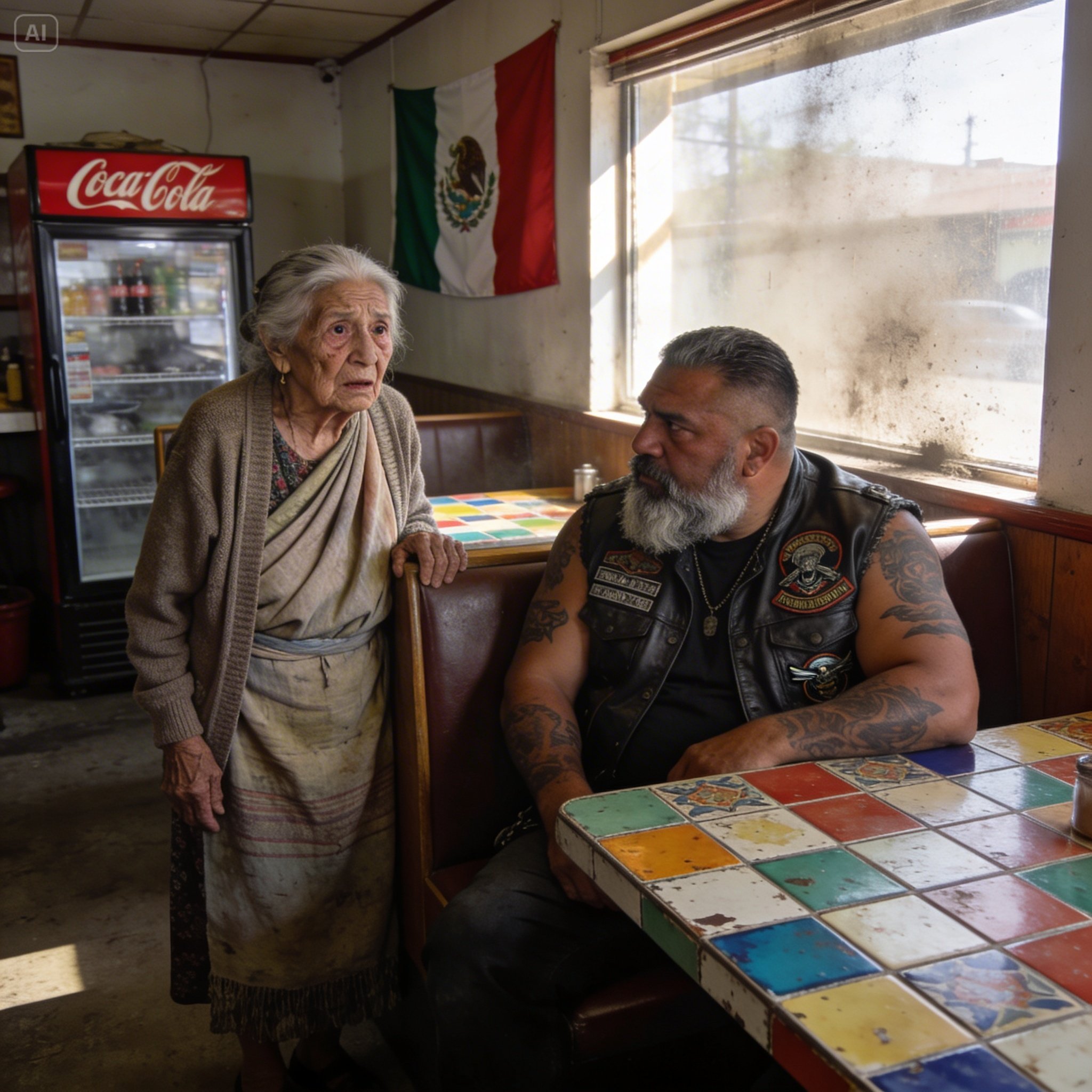 El Oso no movió ni un solo músculo. Su inmenso cuerpo, enfundado en cuero negro y mezclilla gastada, estaba tenso como un resorte industrial. Sus antebrazos, apoyados sobre la mesa, eran un lienzo de cicatrices blancas y tatuajes borrosos hechos en alguna prisión de máxima seguridad o en algún callejón oscuro de la frontera. Un cráneo con una serpiente saliendo de la cuenca del ojo parecía mirar fijamente el pequeño estómago de la anciana.