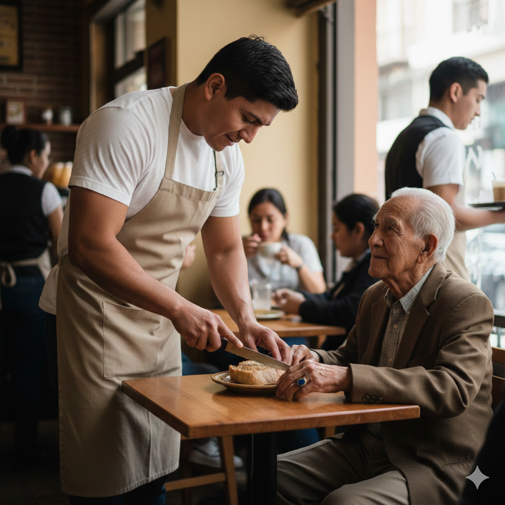 Pero yo veía algo más. Veía una soledad digna. Así que, a pesar de los regaños de mi jefe, decidí tratarlo con respeto. “Buenos días, Don Teodoro, ¿le traigo su café negro?”. Él solo gruñía. Pero persistí. Un lunes, noté que sus manos, deformadas por la artritis, temblaban violentamente mientras intentaba cortar su pan tostado con el cuchillo sin filo de la cafetería. Sin decir palabra, me acerqué, tomé el cuchillo suavemente y le corté el pan en cuatro cuadrados perfectos, fáciles de comer. Por primera vez, me miró a los ojos. Había un brillo de sorpresa, tal vez de gratitud. Asintió levemente. Ese fue mi mayor triunfo.