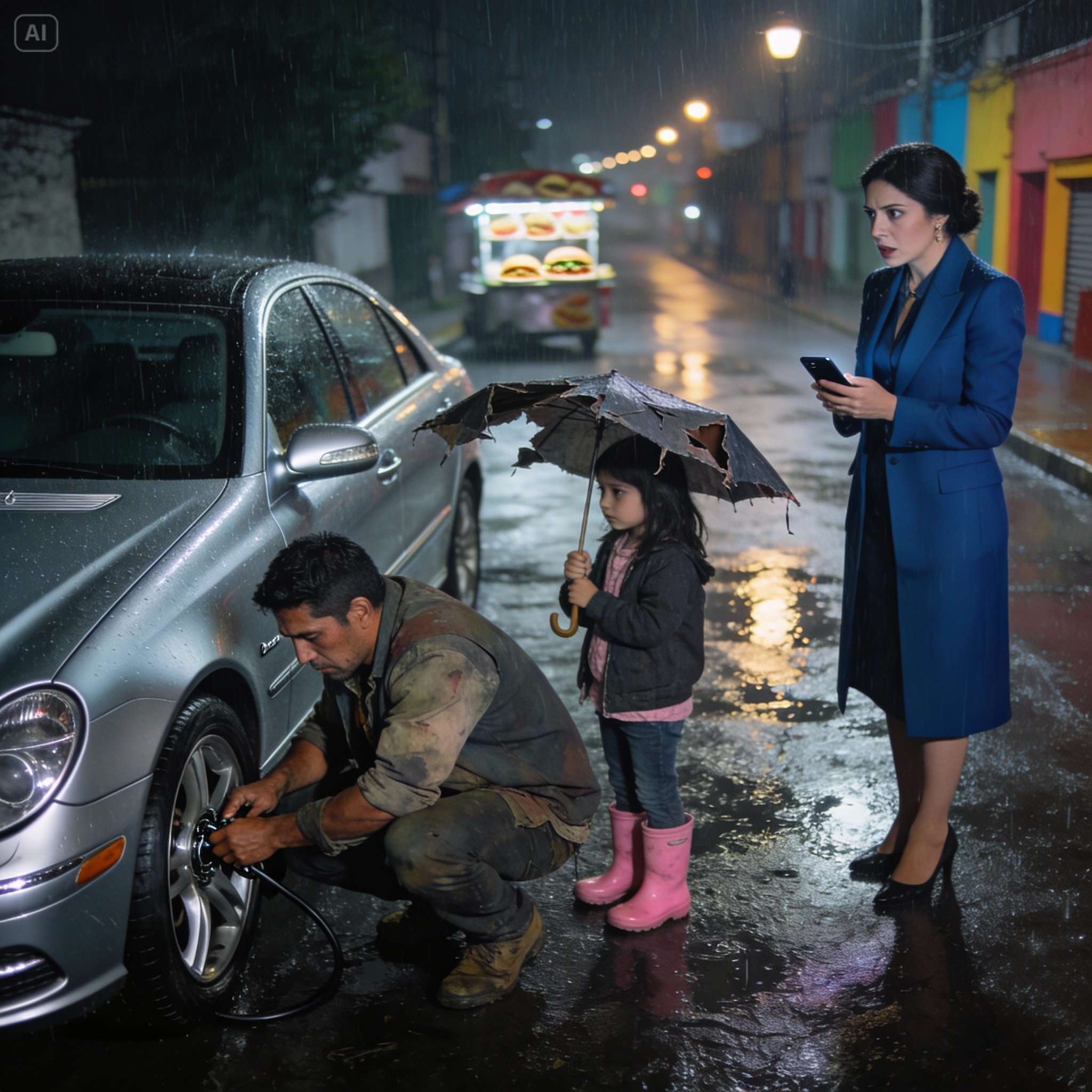 La mujer miró a la niña y luego a Darío, quien ya se estaba quitando la chamarra para no ensuciarla más, quedándose en una camiseta gris delgada bajo el aguacero. Por primera vez, la expresión de la mujer cambió de miedo a asombro.