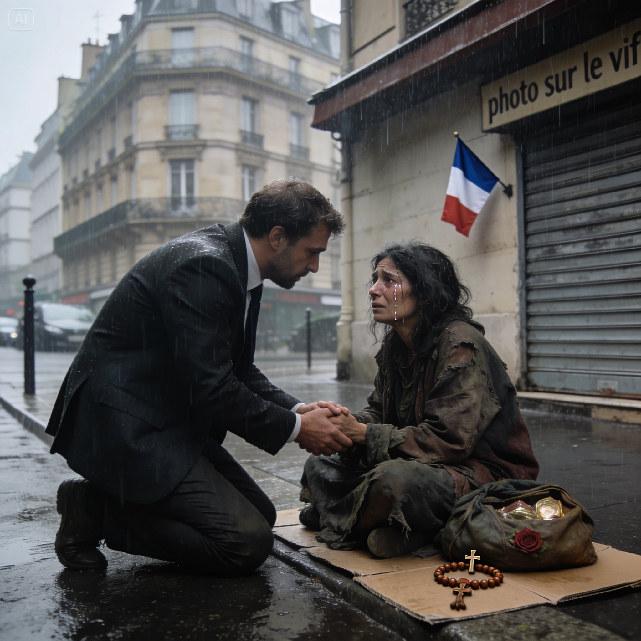 Je ne raccroche même pas. Je cours. Je traverse la place Bellecour sous l’orage qui éclate enfin, les éclairs déchirant le ciel de Lyon. Je cherche parmi les silhouettes errantes, les oubliés du système, ceux que l’on ne regarde jamais. Et soudain, mon regard s’arrête. Près d’une bouche d’aération, une femme est assise sur un carton détrempé. Elle porte une veste déchirée, ses cheveux autrefois si soyeux sont emmêlés, ternes. Elle tient un gobelet en plastique et un carton où est écrit à la main : “S’il vous plaît, faim.”