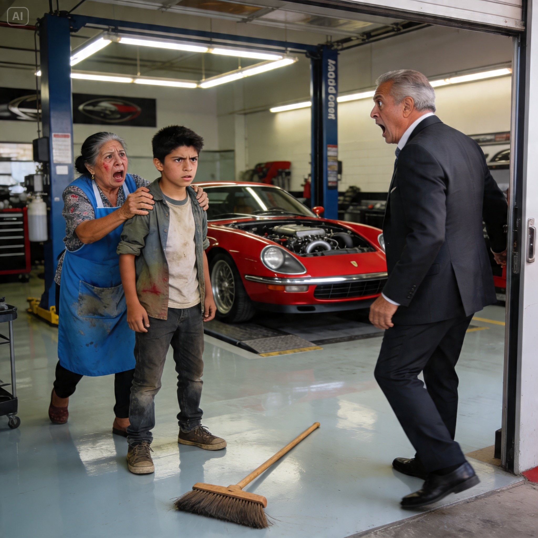 “Vámonos, Mateo, por favor”, me susurró con lágrimas en los ojos, apretando la jerga contra su pecho. Pero vi a Don Elías darse la vuelta, derrotado por una bola de estafadores de traje que le cobraban los millones por cambiar piezas sin tener ni la más mínima idea. Solté la escoba.