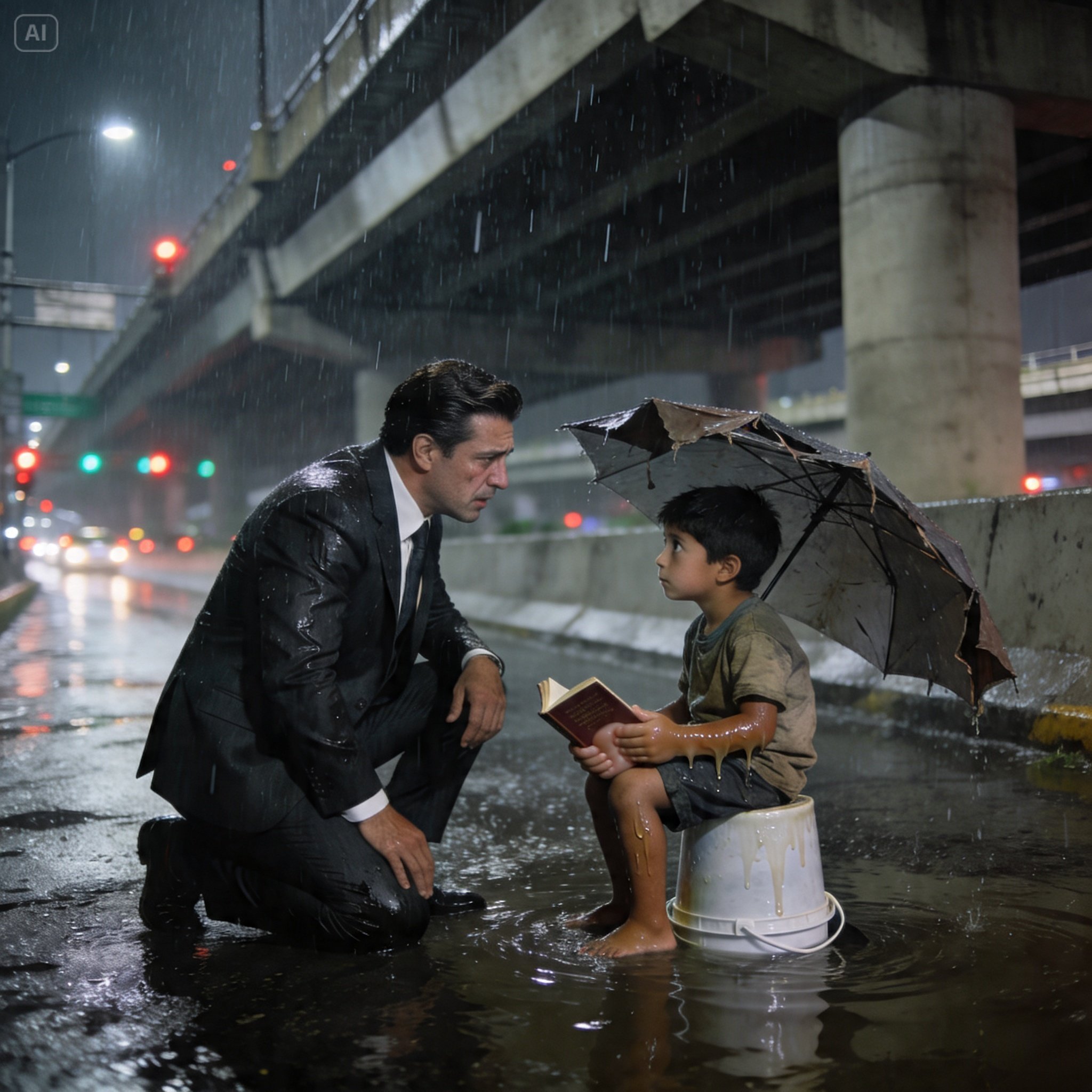 Fue entonces cuando lo vi, una imagen que me sacudió hasta los huesos. Justo debajo de un puente cerca del Viaducto, iluminado a medias por un poste que parpadeaba, había un niño diminuto. Estaba sentado sobre una cubeta de pintura volteada, cubriéndose con un paraguas destrozado que no servía de absolutamente nada contra la tormenta.