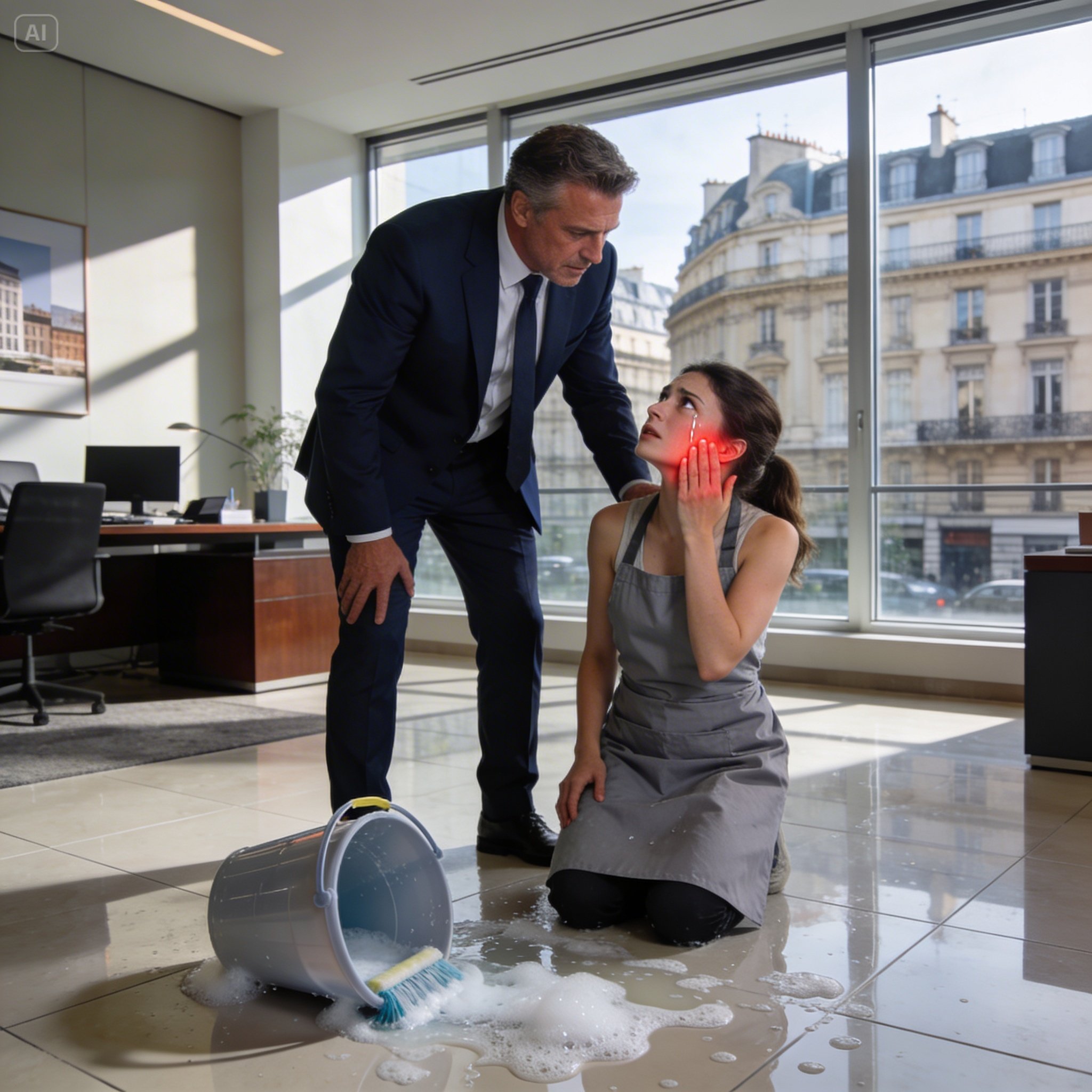 Jean-Marc Morel, le grand patron de “Lumière Immobilier”, se tenait devant moi, le visage rouge de rage. Sa main ouverte tremblait encore après l’impact. À mes pieds, le seau s’était renversé et l’eau sale se répandait lentement sur le sol parfaitement ciré.