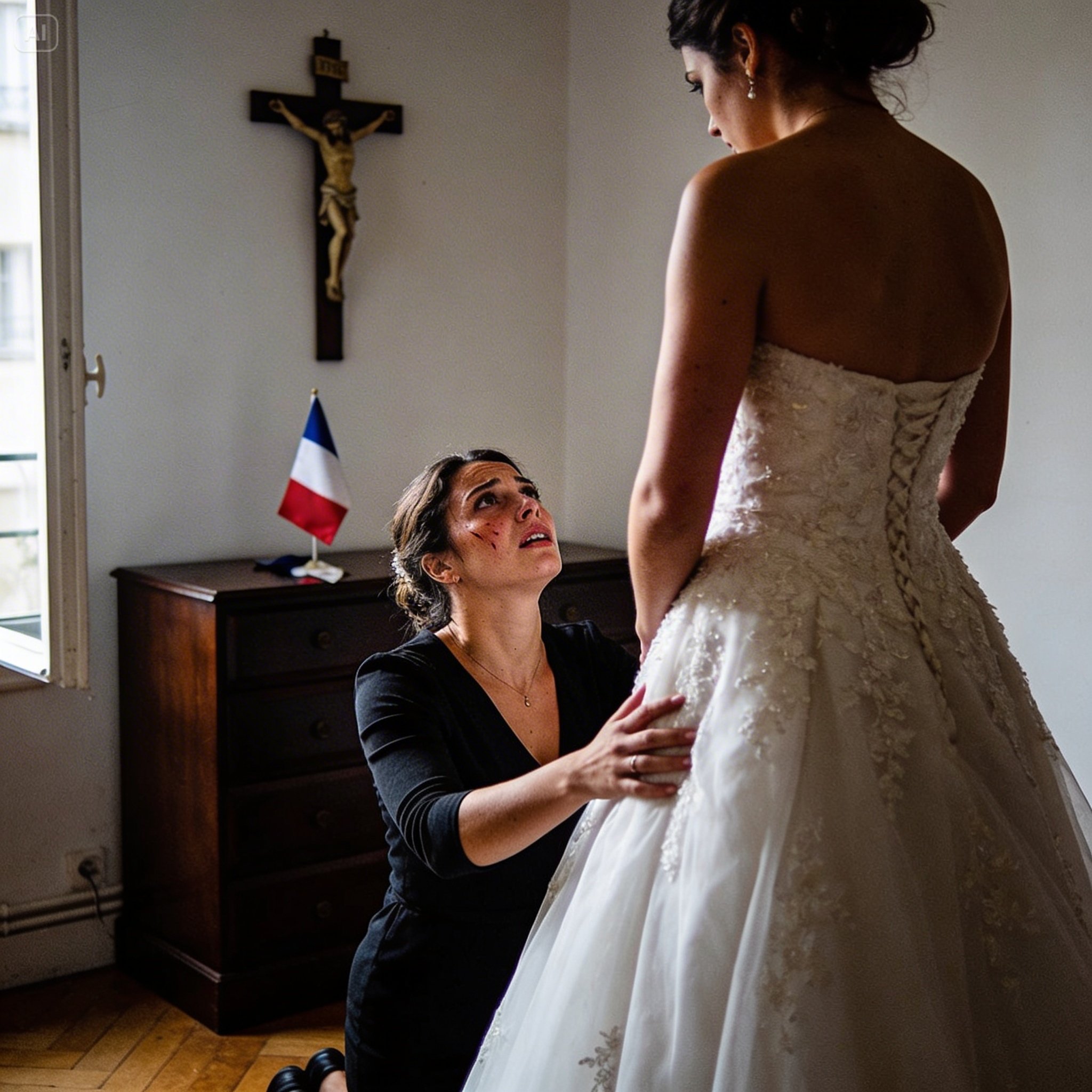 Elle a eu un léger mouvement de recul, avant de se raviser et de me laisser approcher. Un silence étrange s’est installé, seulement troublé par le froissement du tissu sous mes doigts. J’ai tiré doucement sur le jupon pour ajuster l’ourlet, mon geste précis et habitué. Pour faire ça bien, je me suis agenouillée, comme une dame de compagnie servant sa reine. Mes mains s’affairaient sur les couches de tulle, cherchant la perfection pour son grand jour.