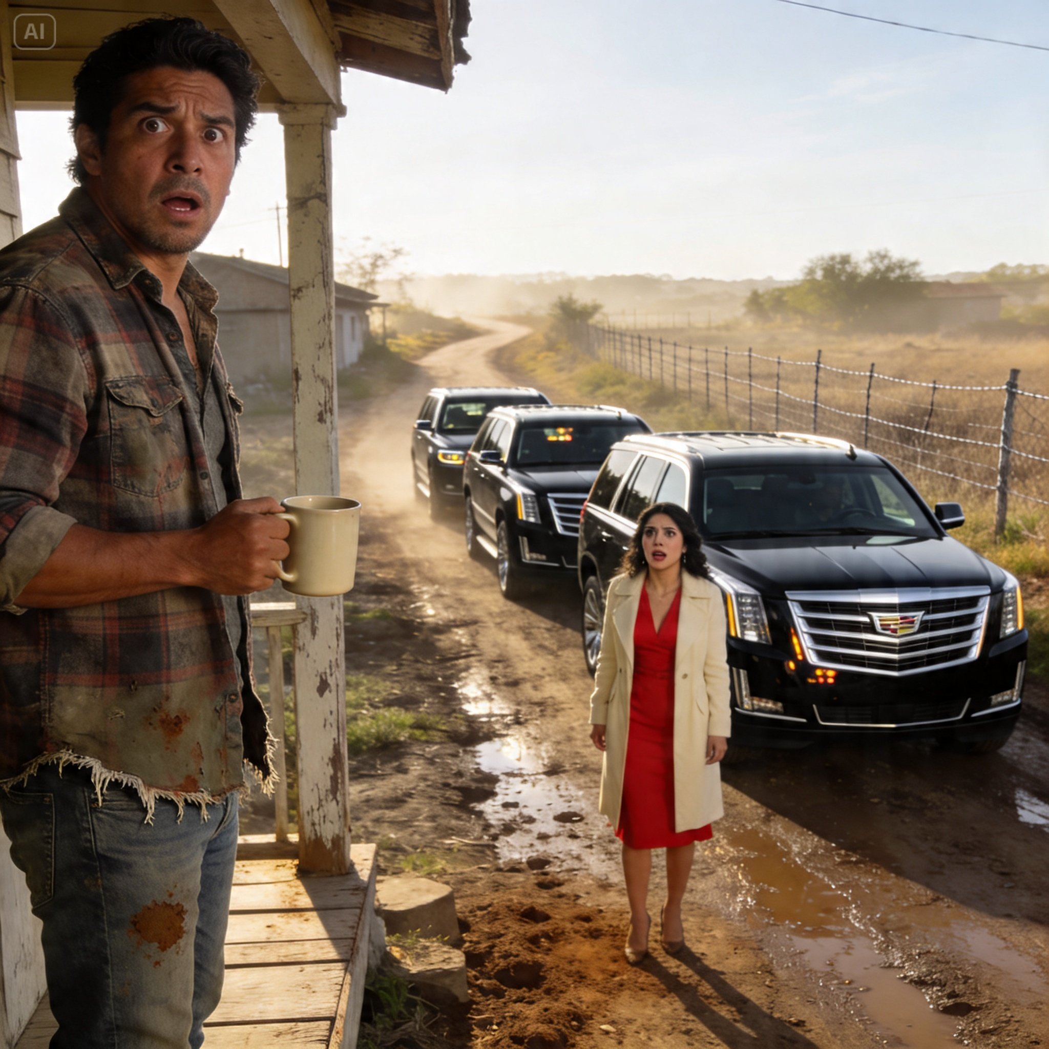 Me paré en el porche de mi casa a las 7:43 de la mañana con una taza de café humeante y me quedé de piedra. El camino de tierra frente a mi cerca estaba literalmente sepultado bajo una fila interminable de cofres negros y parrillas cromadas. Eran camionetas de lujo, de esas que solo se ven en las lomas, con motores que rugían suavemente como si nunca hubieran pisado el lodo de este pueblo.