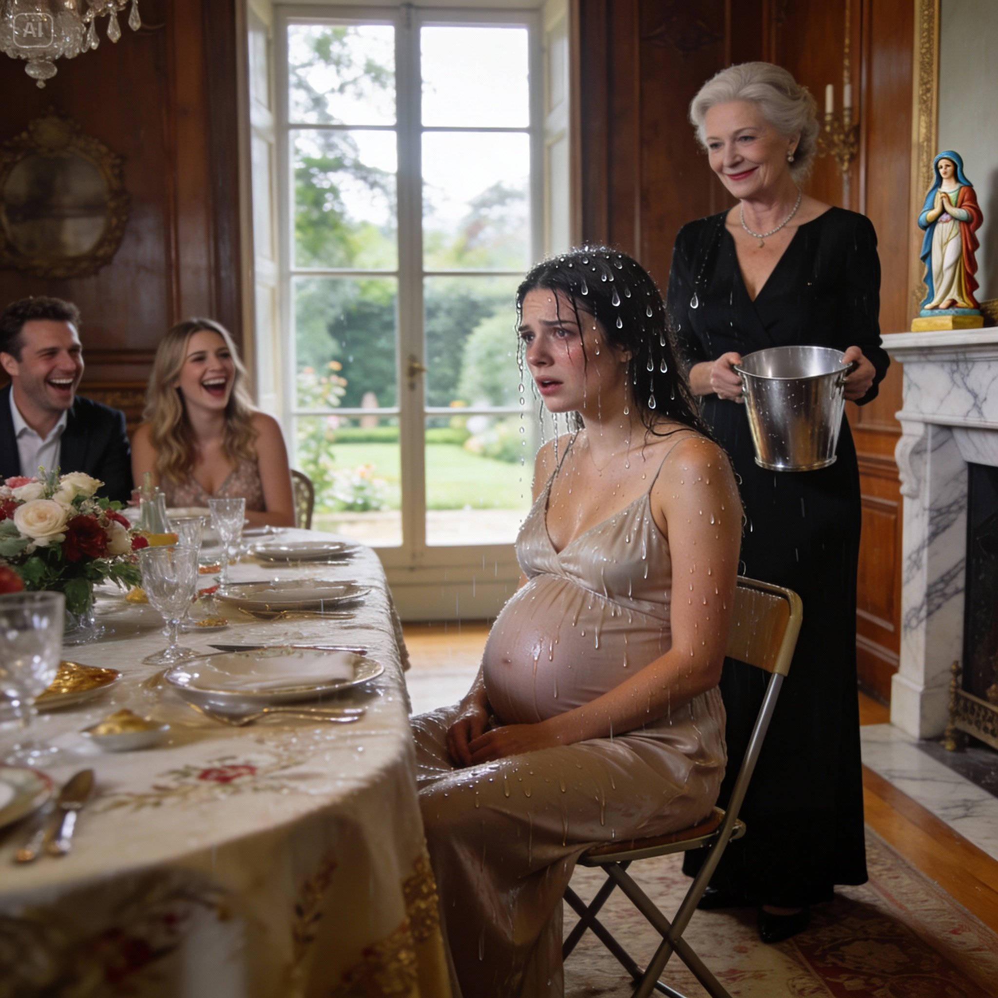 Le contenu du seau à champagne s’est déversé sur moi en une cascade glaciale. L’eau sale et gelée a coulé sur ma tête, dans mon cou, a trempé mes cheveux et ma robe de part en part. Le choc thermique m’a coupé le souffle. Mon corps tout entier s’est contracté violemment, et j’ai senti le bébé sursauter brutalement à l’intérieur de moi, comme s’il avait lui aussi reçu le coup.