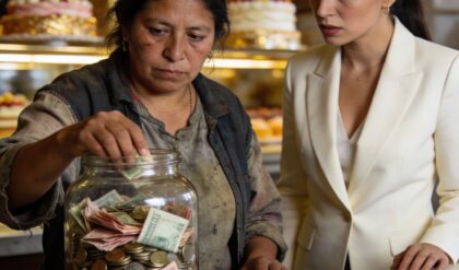 Elena puso el frasco justo frente a la gerente, mostrando los ahorros de meses de sacrificio, peso sobre peso, privándose de comidas para darle ese gusto a su madre. El silencio en la tienda se volvió denso, de ese que se siente justo antes de que algo estalle.