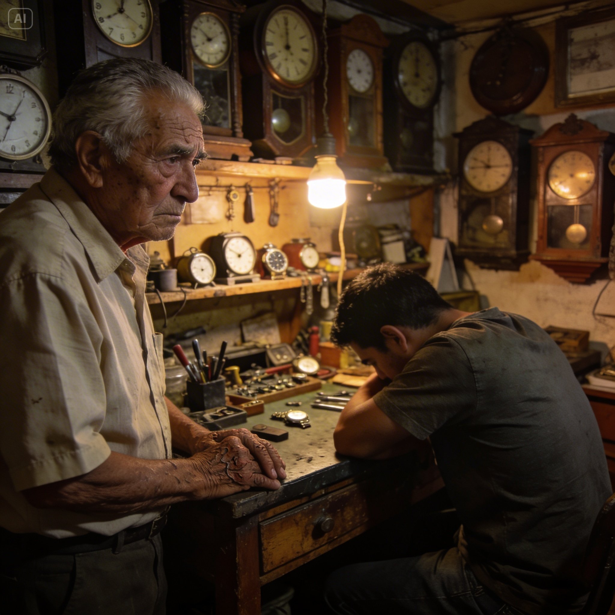 Las paredes guardan más que inventario; guardan memoria. Relojes de bolsillo con cristales rotos, maquinarias con sonerías dobladas. La gente cree que arreglo relojes; lo que realmente hago es negarme a que el tiempo se detenga para las cosas que importan.