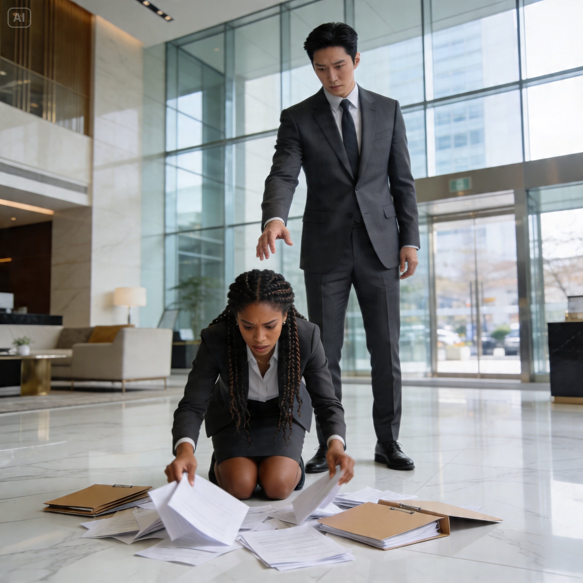 —¡Híjole, perdón! De verdad, mil disculpas, es que estos folders parecen que tienen vida propia hoy —dije en voz alta, olvidando por un segundo que estaba en Corea y no en la oficina de mi tío. Me puse de rodillas de inmediato, tratando de recoger el desastre con las manos temblorosas. Mis trenzas cayeron sobre mis hombros mientras me apresuraba, sintiendo la mirada de todo el mundo quemándome la nuca.