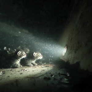 Ils étaient acculés contre un mur de sédiments, au fond d’une impasse. Quatre petites boules de poils ébouriffées, gris et blanc, tigrées, sales. Ils étaient minuscules, peut-être cinq semaines à peine. Mais dans la lumière crue de la lampe, ils se sont transformés. Ils ont gonflé leur fourrure. Ils ont ouvert la bouche, montrant des dents minuscules, et ils ont craché.