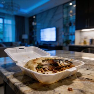 Il sort les boîtes en plastique. L’odeur frappe immédiatement. L’huile de palme, le poisson séché, le fumbwa. Une odeur dense, terreuse, qui n’a rien à faire dans cet intérieur minimaliste et gris.