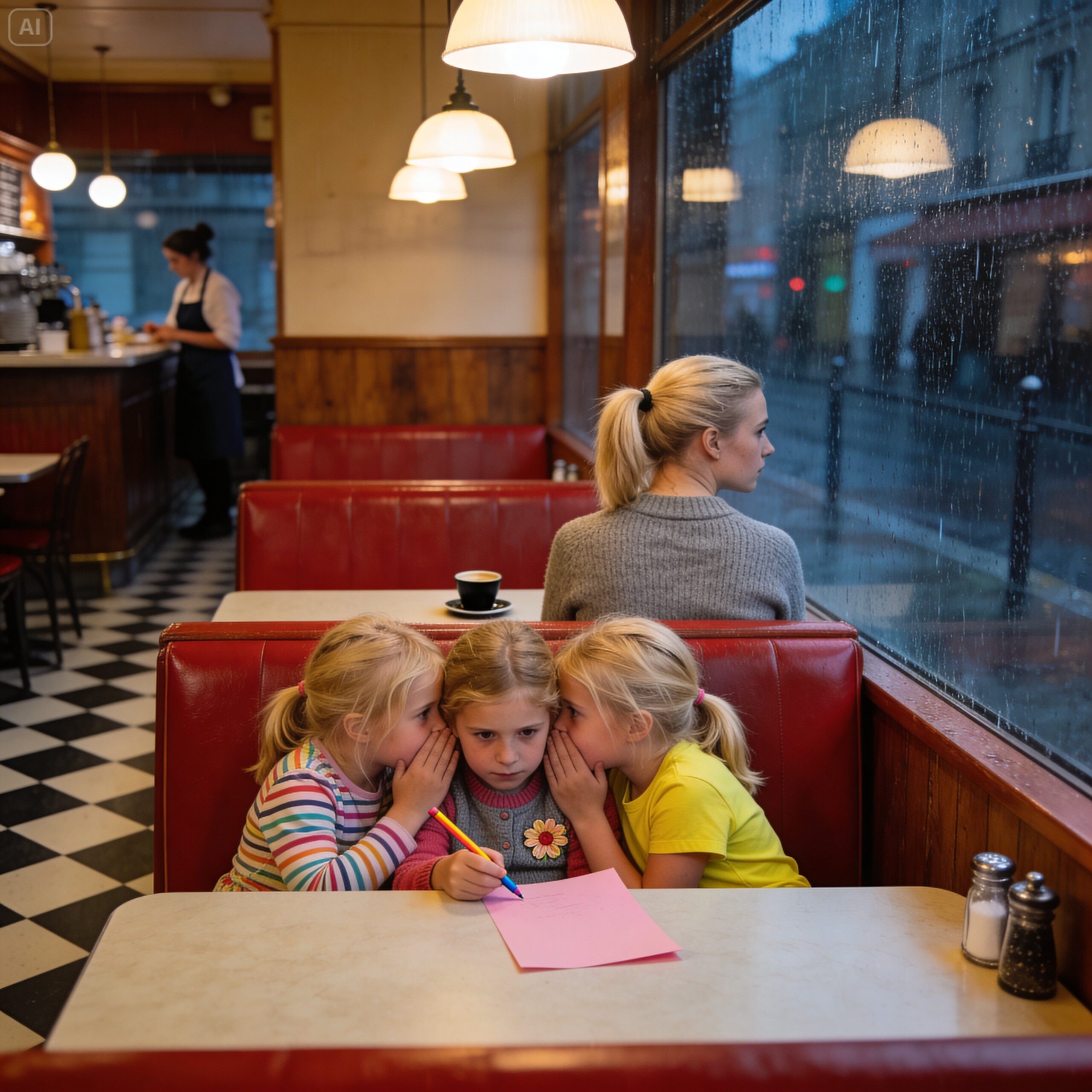 Les filles se sont précipitées sur la banquette en skaï rouge, leurs cartables volant dans tous les sens. Le même rituel chaque semaine. Chloé, l’aînée de six minutes, s’assoit côté fenêtre pour regarder les passants. Emma, la sensible, se blottit contre le mur comme pour se protéger du monde. Et Sophie, la casse-cou, se met au bord, prête à bondir à la moindre occasion.