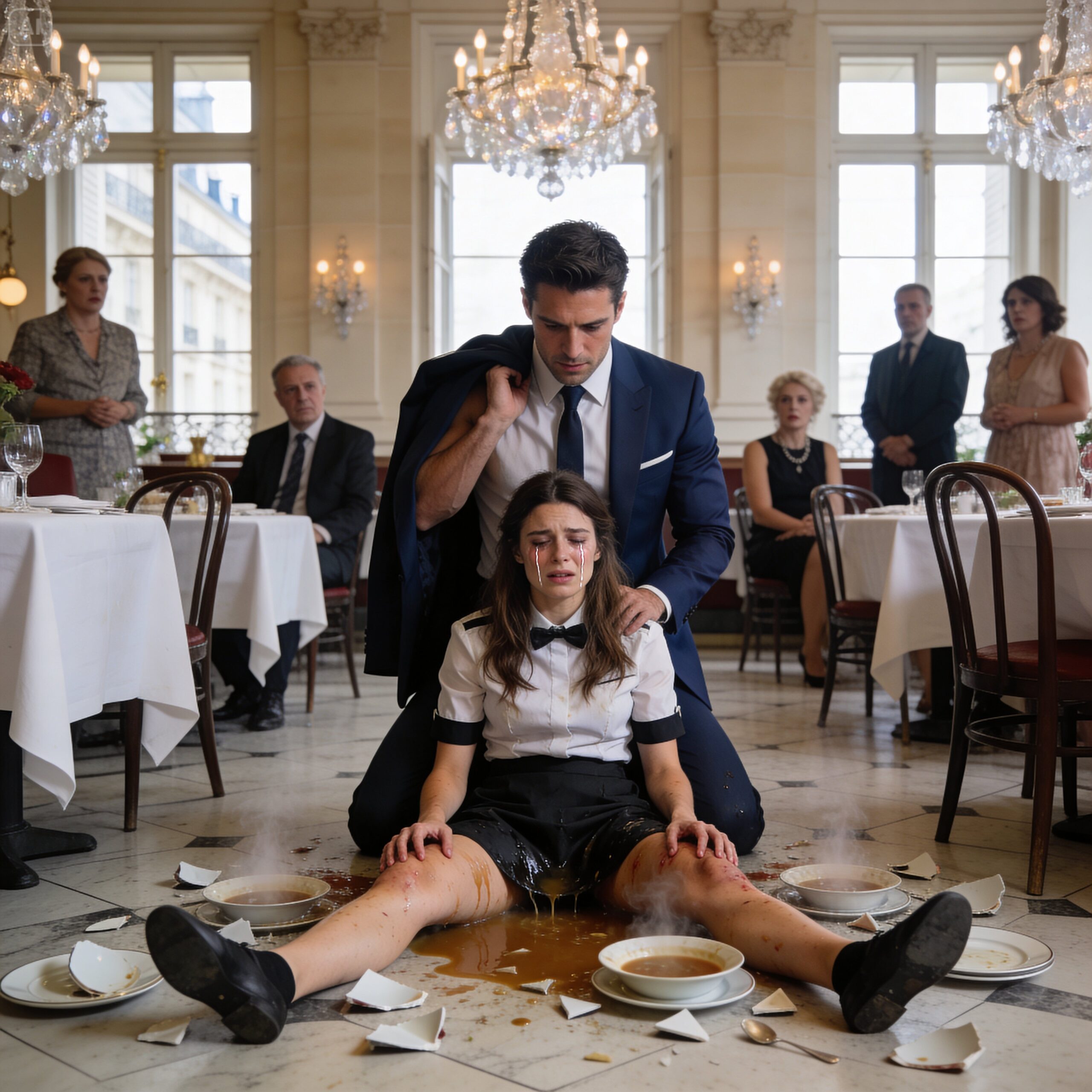 Ce n’était pas un cri normal. C’était un hurlement viscéral, strident, de pure agonie qui fracassa l’ambiance feutrée du Lys Noir. Le bouillon brûlant collait à sa peau. Le gruyère fondu agissait comme du napalm, brûlant son épiderme et cuisant la chair en dessous. Elle s’effondra sur le sol de marbre, perdant totalement le contrôle de son corps. Le plateau d’assiettes sales qu’elle tenait se brisa autour d’elle, projetant des éclats de porcelaine, mais elle ne les sentit pas. Tout ce qu’elle ressentait, c’était ce feu blanc, aveuglant, qui consumait ses jambes.