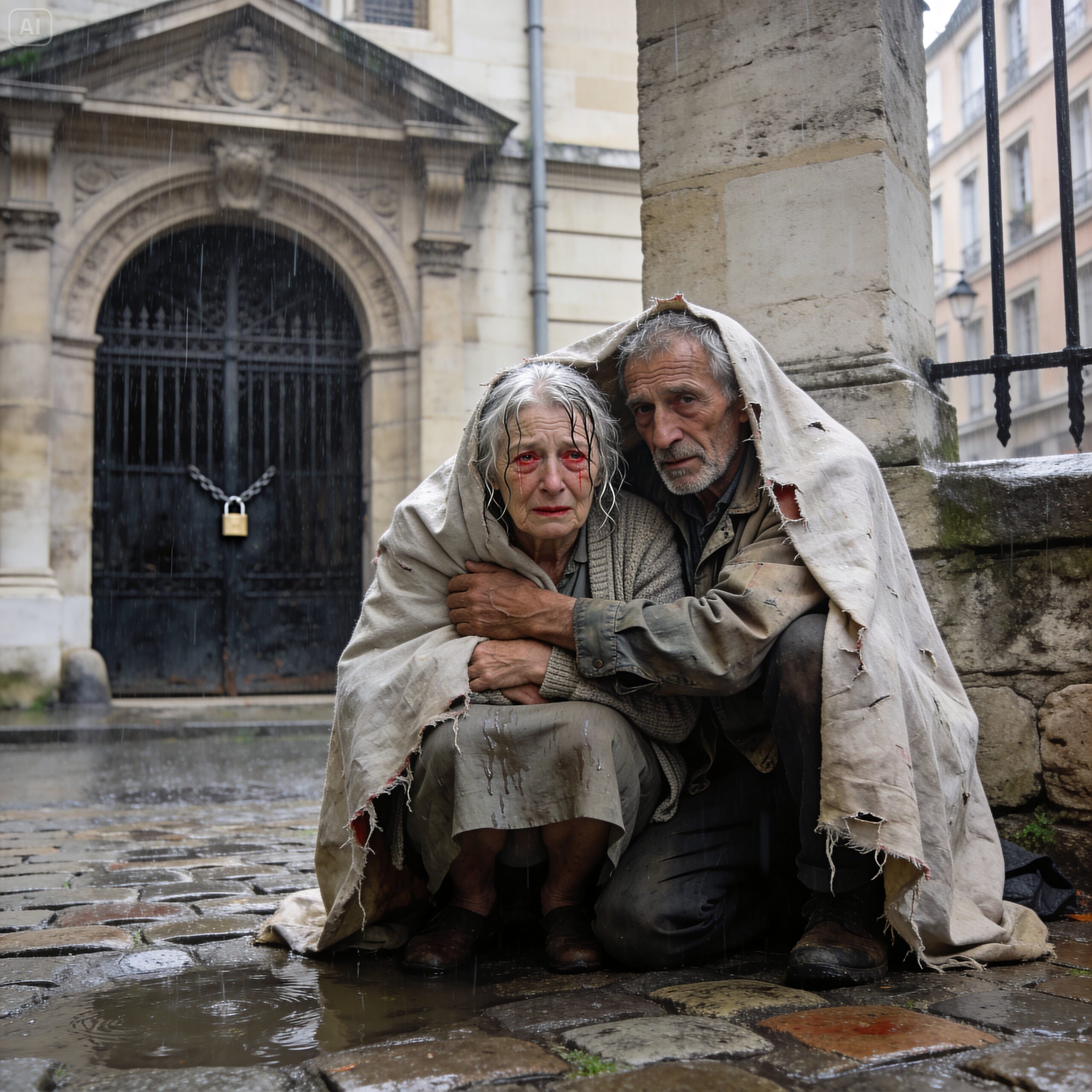 Et sous le porche de l’église en face, recroquevillés contre la pierre froide, deux silhouettes grelottaient sous une couverture de survie.