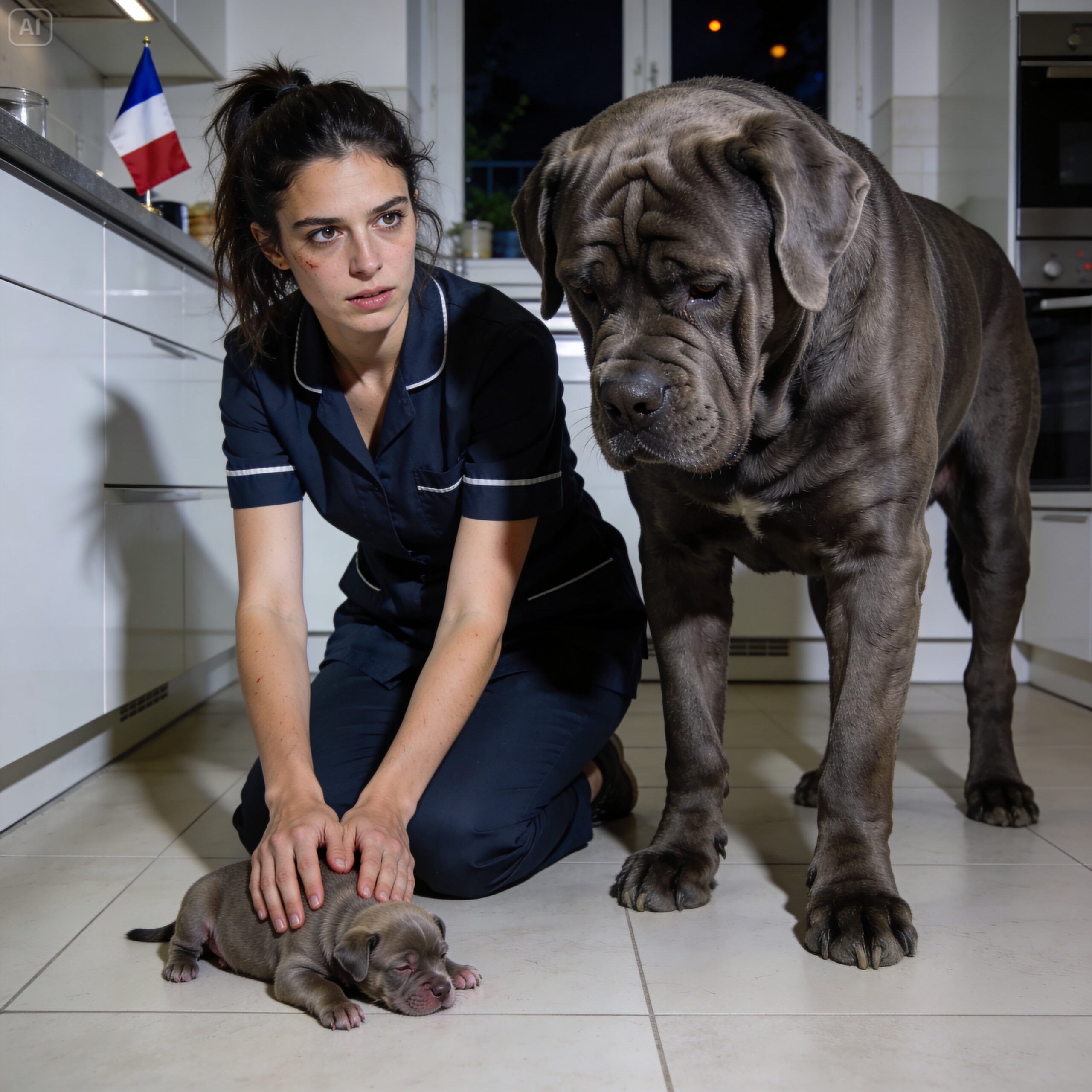 Je suis restée assise sur le sol de la cuisine, le chiot poussant de faibles cris à l’intérieur du linge, César respirant calmement à côté de moi, et sur mes épaules reposait le manteau qui gardait encore la chaleur d’un homme dont, jusqu’à trois minutes plus tôt, je n’avais jamais été autorisée à regarder le visage directement. Je ne savais pas que cette nuit allait tout changer.