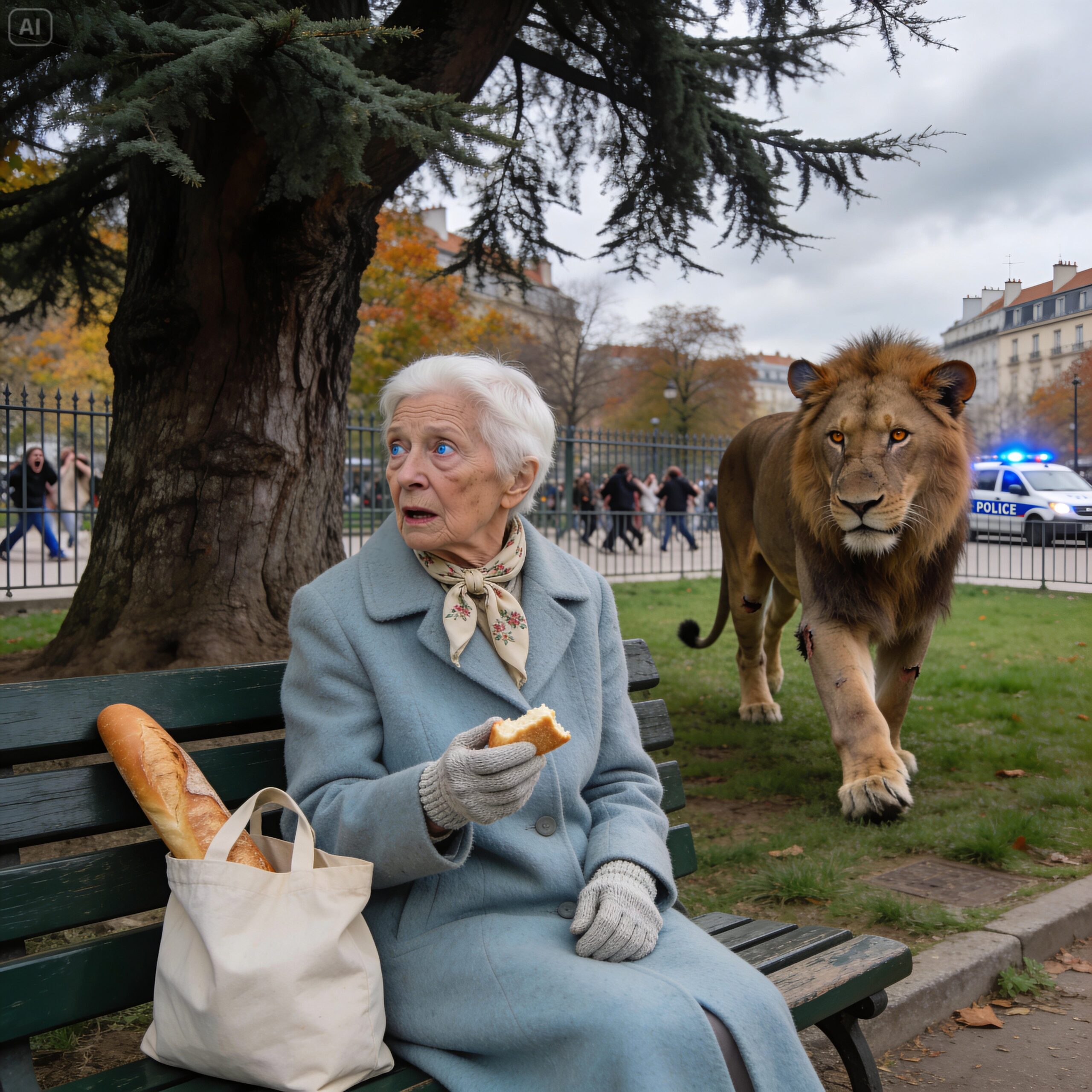 Une femme très âgée, assise bien droite malgré le poids des ans. Un manteau bleu pâle, un foulard imprimé noué sous le menton, des gants de laine fine malgré la douceur de l’air, et à côté d’elle un cabas d’où dépassait le coin d’une baguette de pain. Elle émiettait du pain aux oiseaux d’un geste lent, le visage tourné vers le ciel blanc de cette matinée si particulière. Elle n’avait pas vu le fauve.