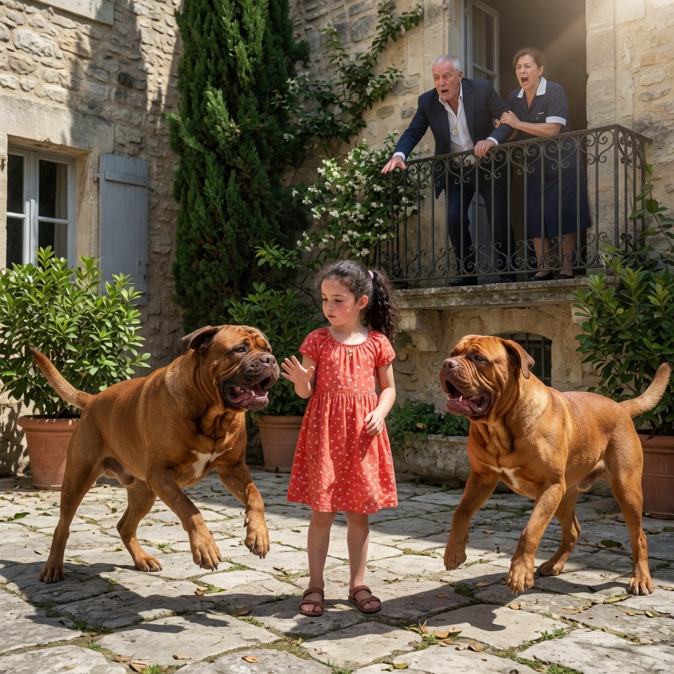 Mes doigts ont tordu la rambarde en fer forgé. J’ai senti le métal grincer sous ma paume. Dans la cour, les deux dogues ont dressé la tête en même temps, leurs cous massifs tendus. Leurs babines se sont retroussées, découvrant des crocs capables de perforer une tôle. Le grondement des deux monstres a roulé comme un orage lointain, puis a enflé, vibrant dans les murs de la bastide.